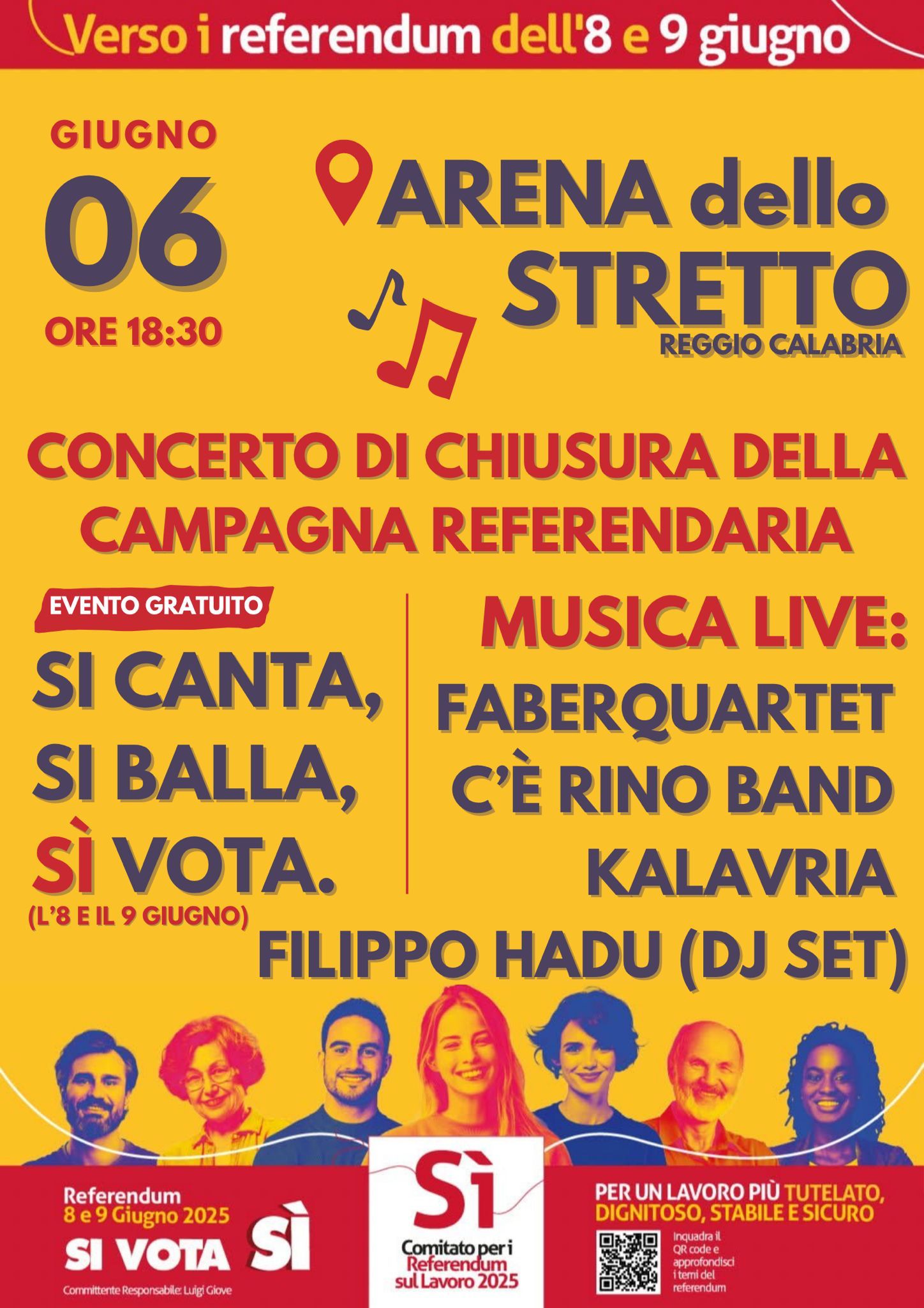 Il Comitato per i Referendum sul Lavoro 2025 annuncia la chiusura della campagna referendaria il 6 gennaio all’Arena dello Stretto, con un’iniziativa che vedrà protagonisti lavoratori ed artisti del territorio. “Abbiamo previsto – si legge in una nota della Cgil Reggio Calabria Locri – la presenza di 3 gruppi musicali e un dj set. Uno spettacolo, un momento di svago, finalizzato però a sensibilizzare su temi per noi cruciali: il lavoro e la cittadinanza. Temi che sono stati al centro di ogni iniziativa, di ogni assemblea pubblica nelle piazze e nei posti di lavoro, che il Comitato referendario ha promosso nell’intera Area Metropolitana, in vista dell’importante appuntamento elettorale dei prossimi 8 e 9 giugno”.
