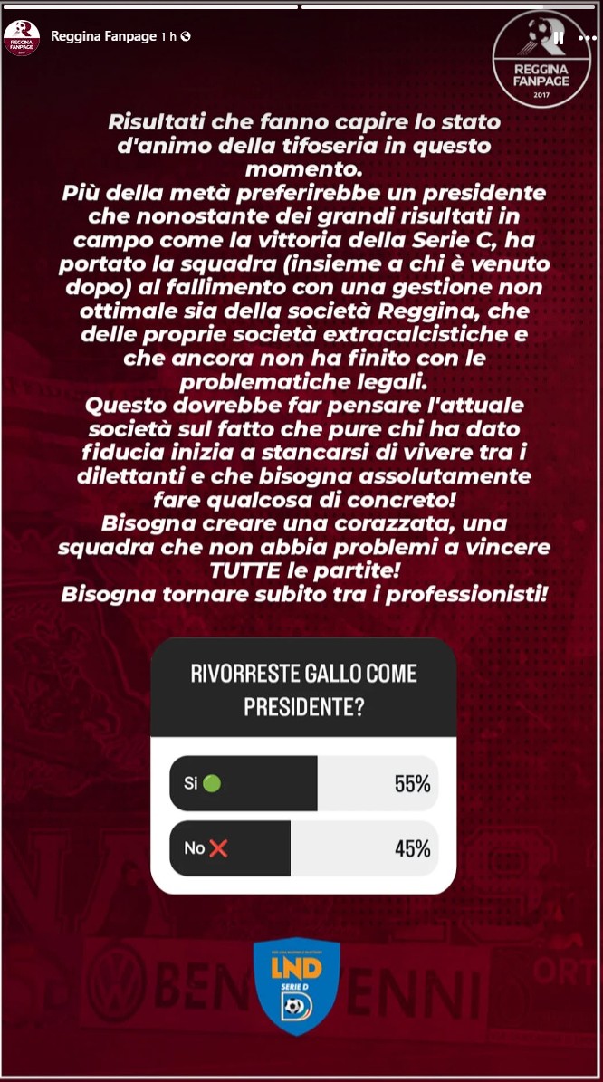 “Prendo questa storia di Reggina Fanpage (che ringrazio per la concessione) come spunto di riflessione. La pagina, seguita da tantissimi cuori amaranto, dopo la “bomba” sganciata ieri su un possibile ritorno di Luca Gallo alla guida della Reggina ha deciso di fare un sondaggio per capire quanti tifosi sarebbero soddisfatti di tutto ciò. I risultati, che ovviamente rappresentano solo una frazione del campione di tifosi della Reggina, sono quelli che vedete. Reggina Fanpage, a differenza nostra, non fa opinione. Meno che mai divisiva. Fa semplice ed equilibrata cronaca. Non è quindi una pagina seguita soltanto da chi sostiene il “Ballarino o niente”, né da chi è dell’opinione opposta. È seguita da tifosi di ogni tipo e idea. Quindi il campione può dirsi rappresentativo.