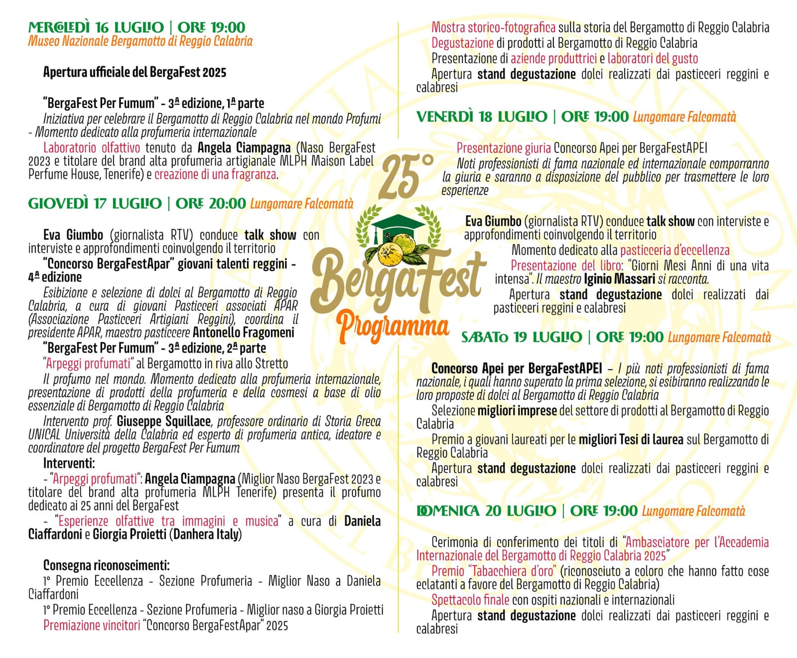 Reggio Calabria si prepara a riaccogliere una delle sue manifestazioni estive più attese: il BergaFest, che dal 16 al 20 luglio 2025 colorerà di profumi e sapori il cuore della città, tra il Museo del Bergamotto e il suggestivo Lungomare Falcomatà. Giunto alla sua 25ª edizione, il BergaFest celebra l’eccellenza del Bergamotto di Reggio Calabria, agrume simbolo del territorio e ingrediente prezioso per profumeria e gastronomia. L’evento si aprirà mercoledì 16 luglio al Museo del Bergamotto con il laboratorio olfattivo “BergaFest per Fumum”, un omaggio al bergamotto nel mondo dei profumi, guidato da esperti come Angela Ciampagna, già insignita del titolo di “Miglior Naso 2023”.