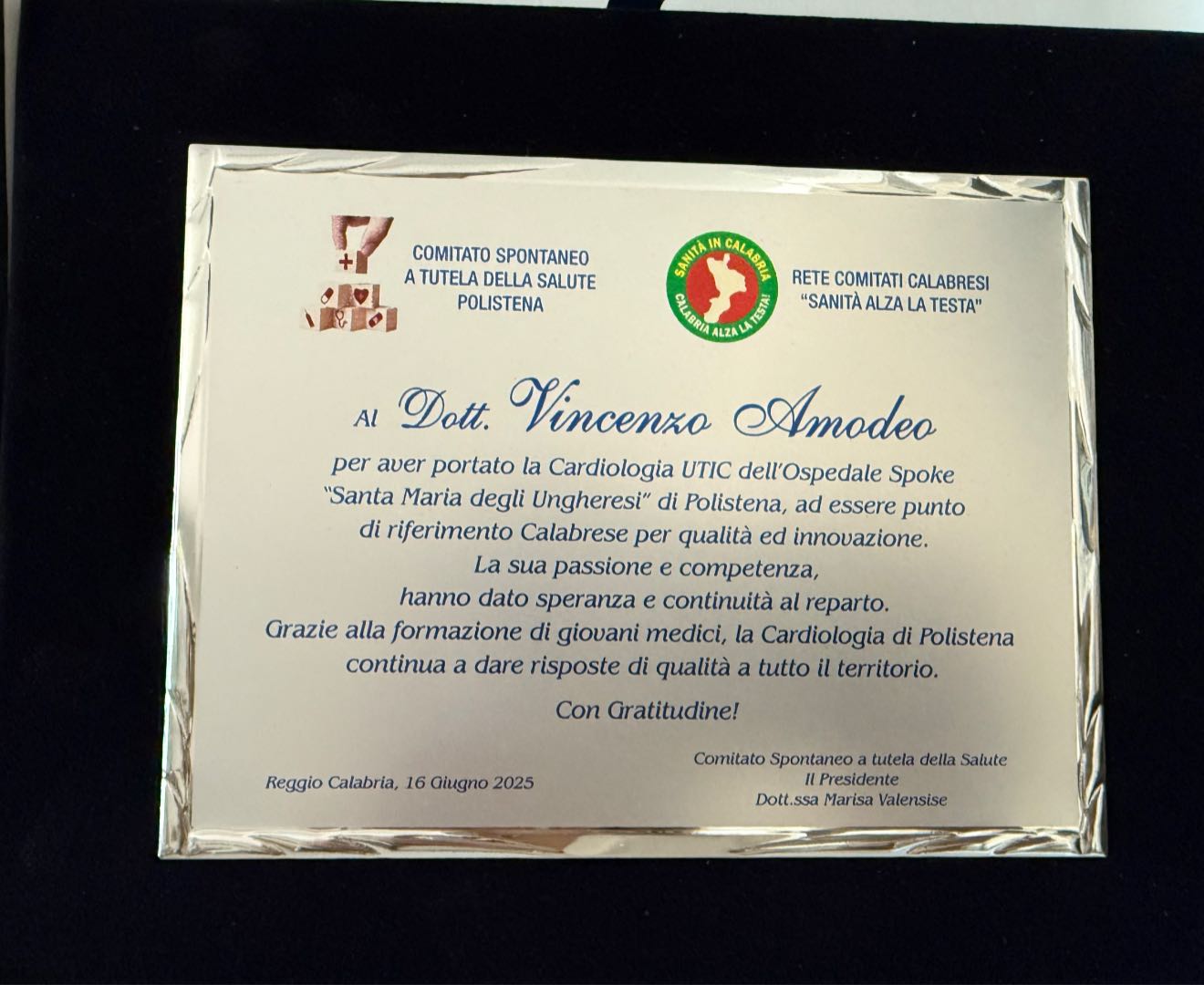 “L’invito al Comitato – scrive il gruppo sul proprio profilo social- è stato per noi motivo di orgoglio ed occasione per omaggiare con una targa ricordo, il dottore Amodeo, già Primario della cardiologia di Polistena ,riconoscendone il valore umano, professionale profuso da tempo, per tutto il territorio della piana di Gioia Tauro”.