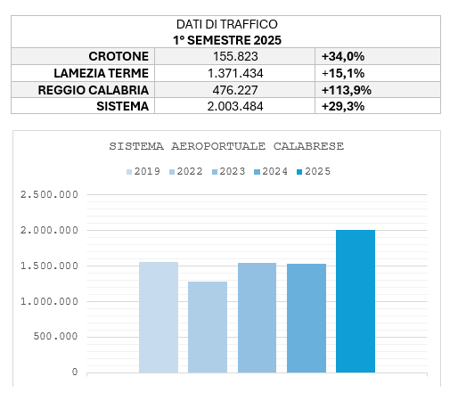 Il 2025 si conferma un anno di straordinaria crescita per gli aeroporti calabresi, che rafforzano il proprio ruolo di hub strategici per il Sud Italia. Con oltre 2 milioni di passeggeri transitati nei primi sei mesi dell’anno (+29,3% rispetto allo stesso periodo del 2024), il traguardo dei 4 milioni entro dicembre appare sempre più concreto. Questo risultato, il migliore di sempre per il sistema aeroportuale calabrese in un semestre, è il frutto di una strategia articolata che ha puntato su una significativa espansione delle rotte internazionali, sull’ottimizzazione dell’offerta domestica e su un importante programma di investimenti infrastrutturali previsti su tutti gli scali, Crotone, Reggio Calabria, Lamezia Terme. La crescita ha riguardato in modo omogeneo tutti e tre gli scali regionali, confermando la solidità del piano di sviluppo avviato da SACAL.
