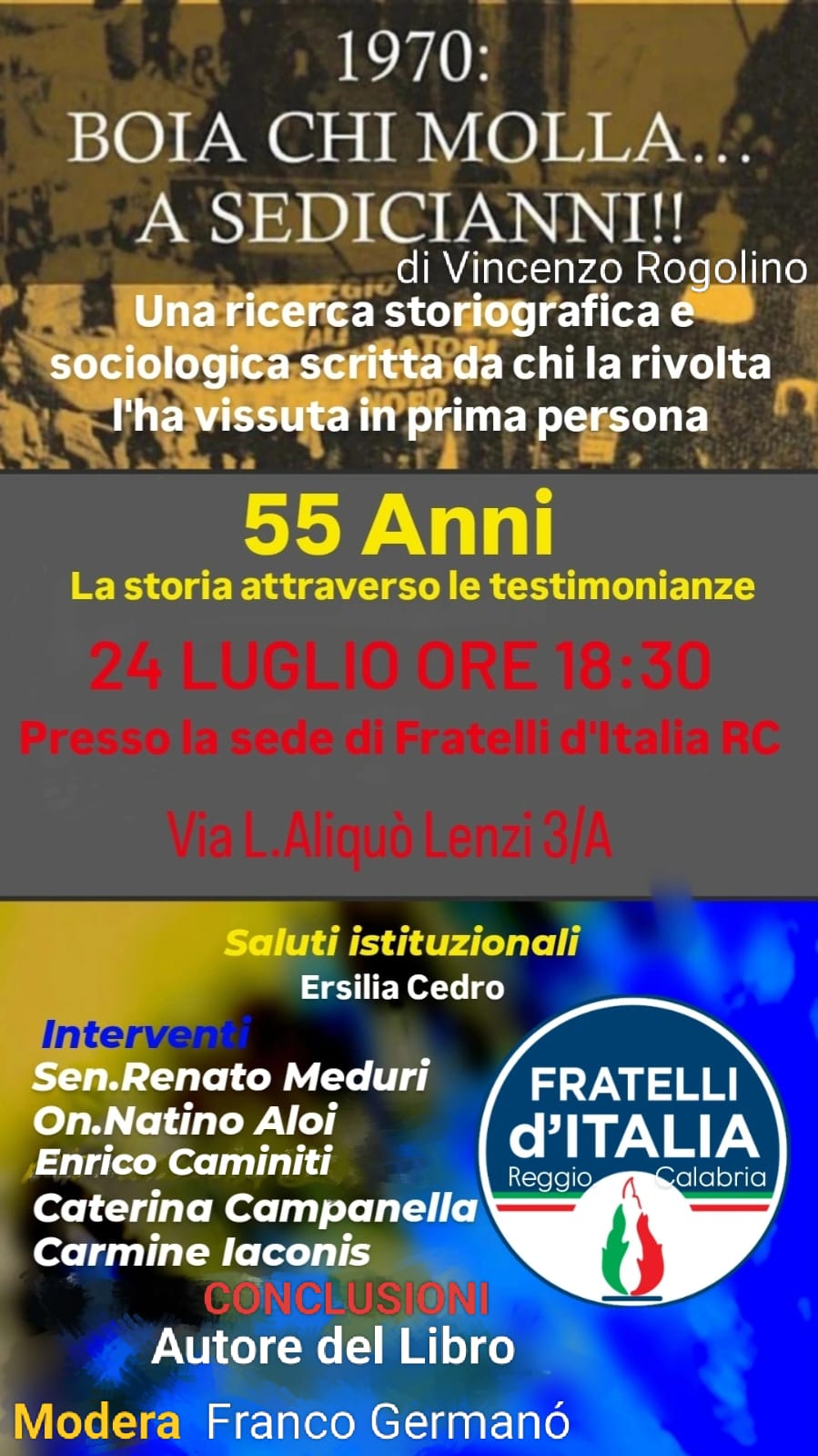 Il Coordinamento di Fratelli d’Italia di Reggio Calabria organizza un incontro pubblico per riflettere, a 55 anni di distanza, sulla Rivolta di Reggio del 1970, un momento cruciale della storia cittadina e nazionale. L’incontro si terrà giovedì 24 luglio alle ore 18:30 presso la sede del partito in via Luigi Aliquò 3/A e rappresenterà un’occasione per rileggere quegli eventi attraverso le testimonianze dirette dei protagonisti e dei familiari delle vittime.