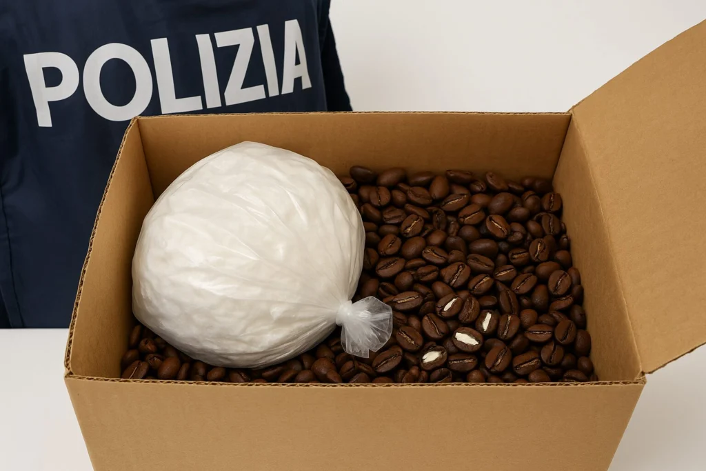 Non mancavano espedienti alternativi per l’importazione; in un caso, gli investigatori della Squadra Mobile sono riusciti ad intercettare la spedizione di un normalissimo pacco affidato alla società DHL, del tutto estranea ai fatti, al cui interno vi era 1 kg circa di cocaina purissima contenuta in chicchi di caffè.