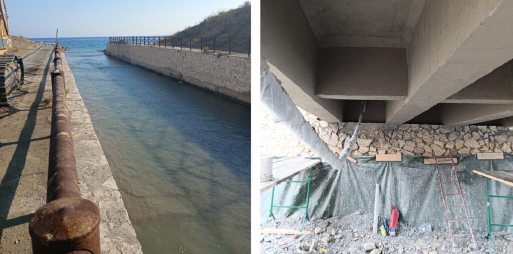 La struttura, che si trova lungo un’arteria particolarmente trafficata, soprattutto durante il periodo estivo, versava in uno stato generale di degrado che ha reso indispensabile un intervento di consolidamento strutturale. Sulla base del progetto, redatto dalla Direzione “Ambiente”, coordinata da Giovanni Lentini, si è proceduto alla riparazione delle travi e della volta del ponte, alla rimozione dell’asfalto deteriorato e alla sistemazione dei due tratti del manto stradale interessati da avvallamenti che compromettevano la sicurezza della circolazione, alla sostituzione delle porzioni danneggiate con materiali altamente resistenti, come acciaio e calcestruzzo ad alta durabilità. Per quanto riguarda la parte inferiore dell’infrastruttura, è stato rimosso il calcestruzzo ammalorato e sostituiti gli elementi metallici corrosi con nuove barre in acciaio, rinforzando ulteriormente la struttura mediante l’applicazione di reti metalliche. L’intero impalcato è stato sottoposto a una scrupolosa pulizia e trattato con prodotti protettivi in grado di contrastare gli effetti corrosivi della salsedine. Completati gli interventi strutturali, si è proceduto allo smontaggio delle impalcature e delle vasche di raccolta; infine, dopo l’asportazione dei sedimenti sabbiosi che impedivano il regolare deflusso delle acque, il canale è stato riaperto.