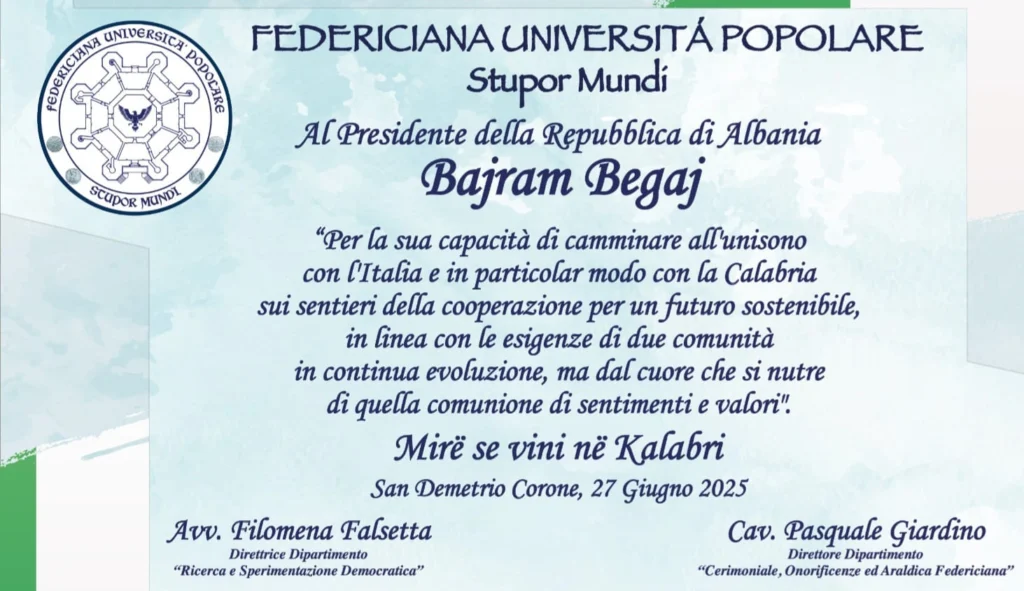 E al Presidente della Repubblica di Albania Bajram Begaj con la seguente motivazione: “per la sua capacità di camminare all’unisono con l’Italia e in particolar modo con la Calabria sui sentieri della cooperazione per un futuro sostenibile, in linea con le esigenze di due comunità in continua evoluzione, ma dal cuore che si nutre di quella comunione di sentimenti e valori”.
