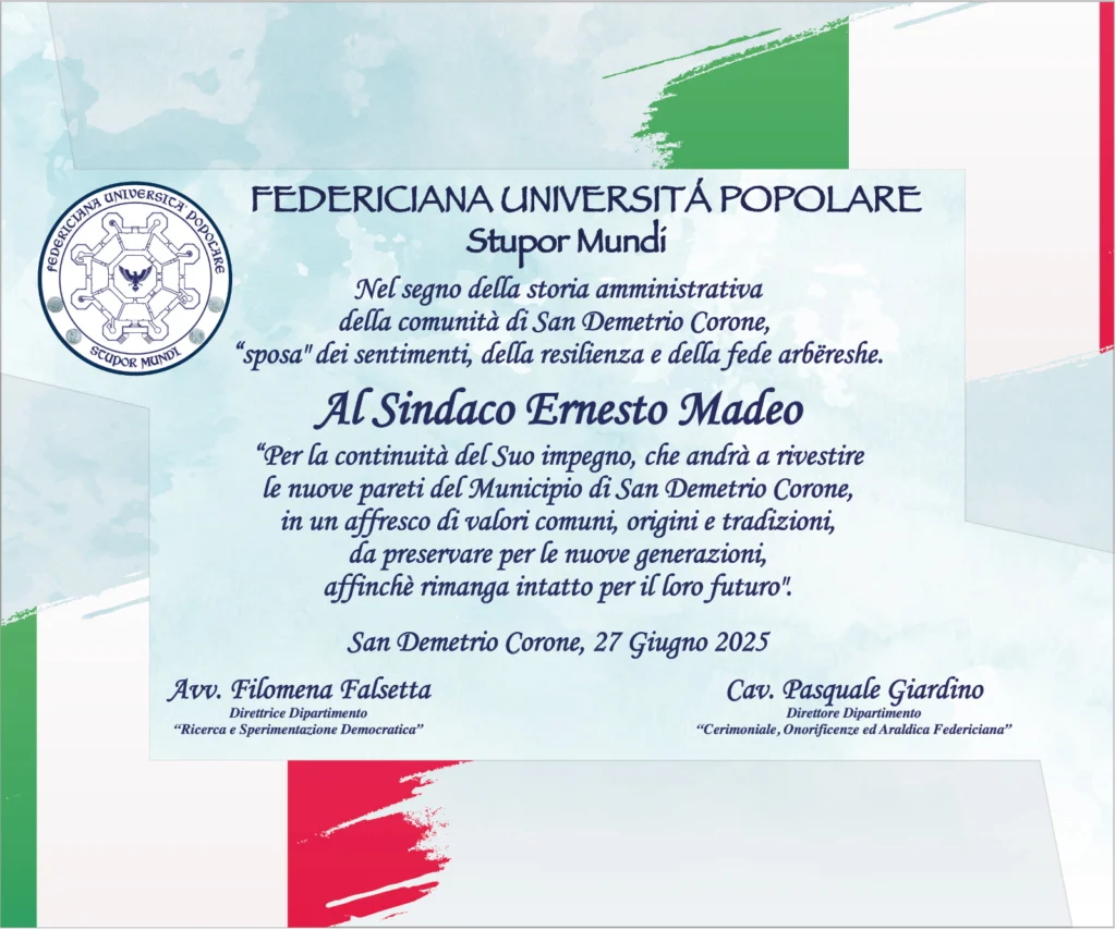 Alla fine dei lavori, si è proceduto alla consegna delle targhe da parte della Federiciana Università Popolare, raffiguranti “il tricolore italiano che sventola al cielo come segno di protezione che unisce le comunità facendole sentire parte di un’unica comunità”, e consegnate dall’Avv. Falsetta e dal Cav. Giardino al Sindaco Ernesto Madeo con la seguente motivazione: “per la continuità del suo impegno, che andrà a rivestire le nuove pareti del Municipio di San Demetrio Corone, in un affresco di valori comuni, origini e tradizioni, da preservare per le nuove generazioni, affinchè rimanga intatto per il loro futuro”.