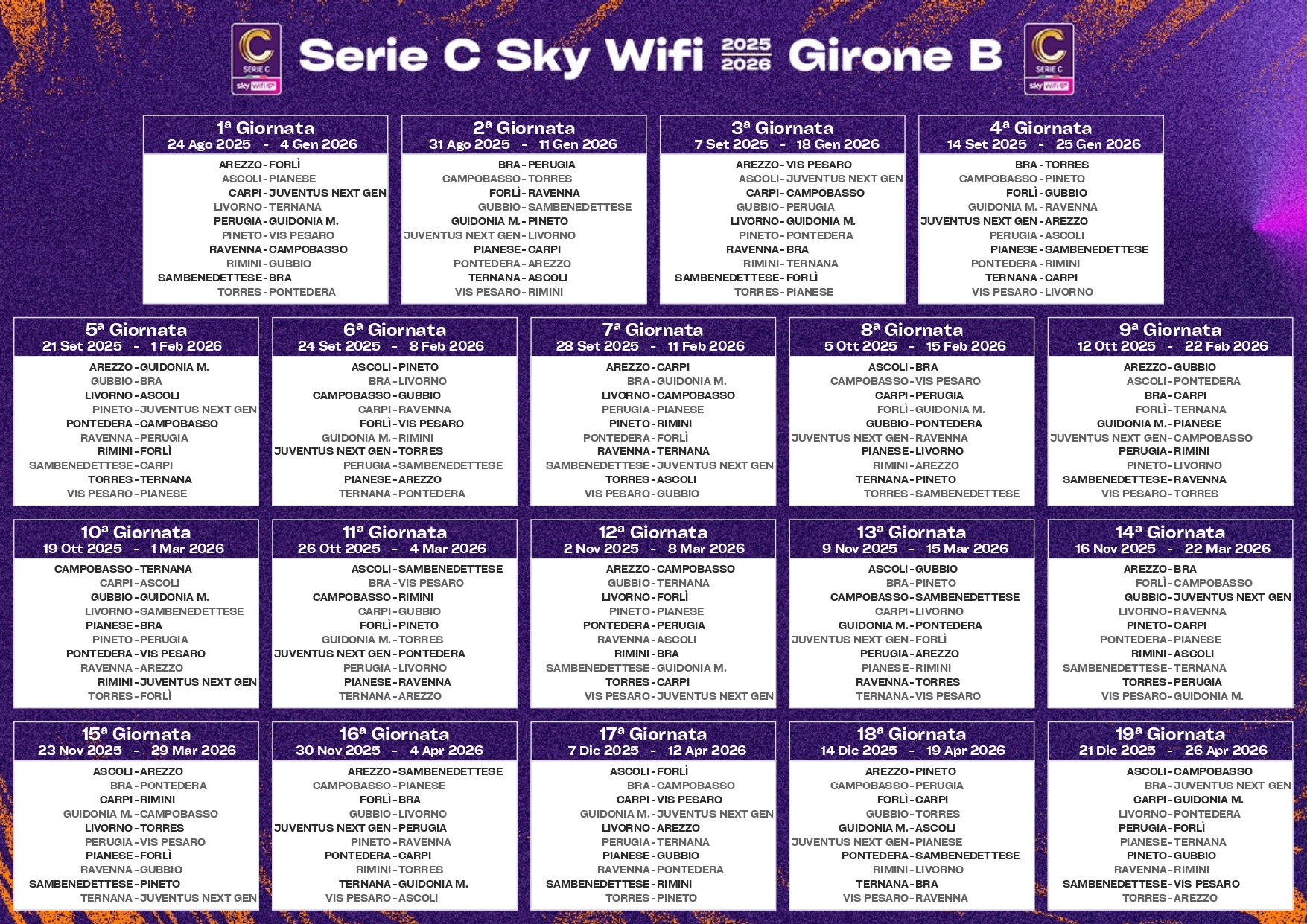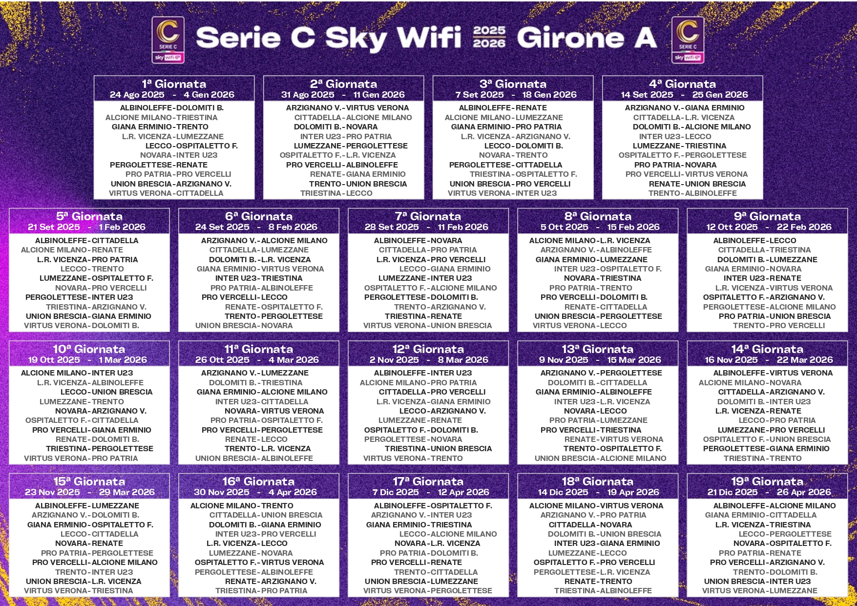 Di seguito i calendari completi dei tre gironi: A, B e C. Si parte il 24 agosto, la stagione regolare si chiude il 26 aprile (cliccare sulle immagini).