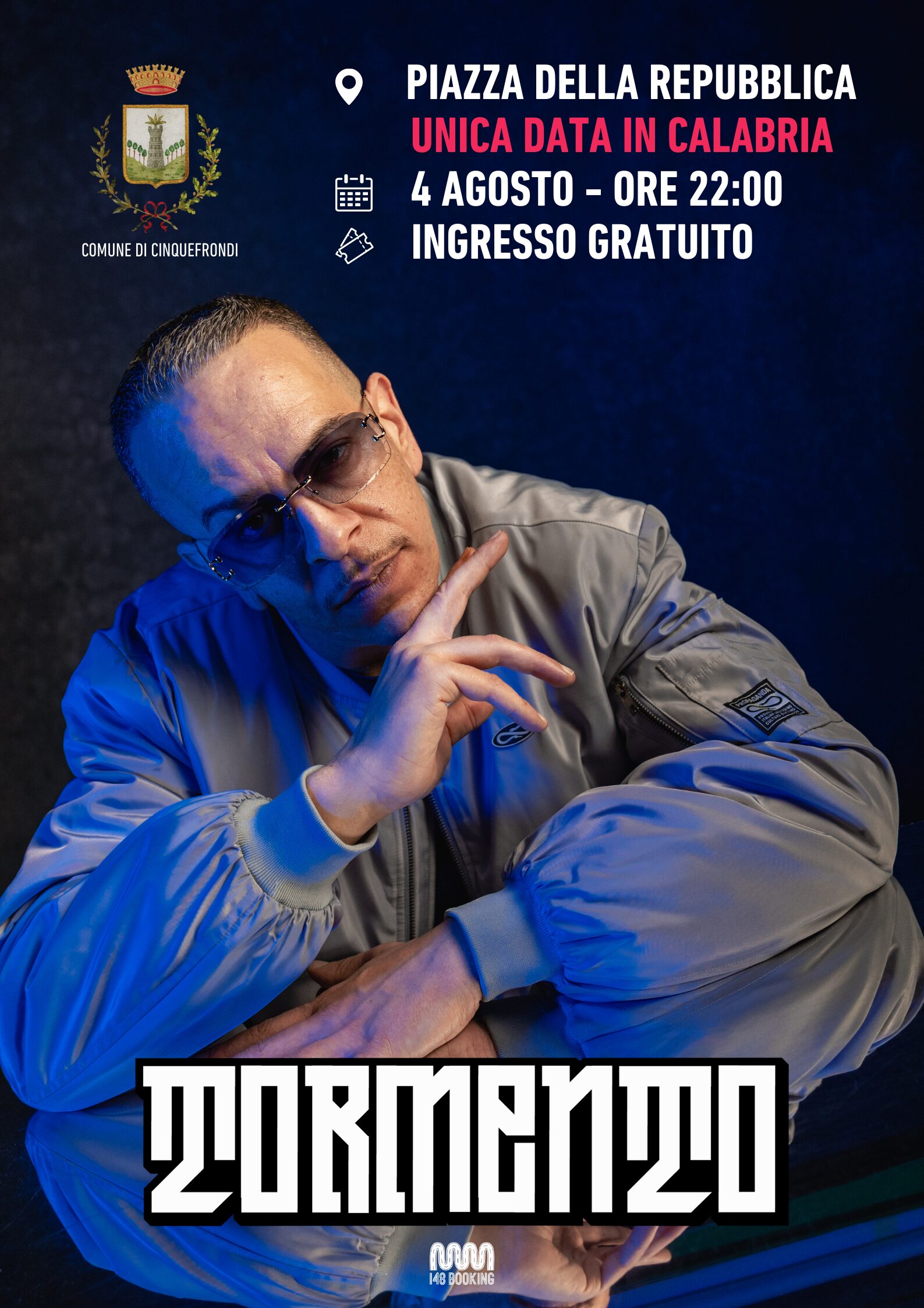 Dopo aver scritto pagine fondamentali della musica urban italiana, da Sottotono fino alla sua brillante carriera solista, Tormento giunge al famosissimo Festival di Sanremo con Shablo, Guè, Joshua e approda quest’ estate nel cuore della Calabria con un concerto gratuito che si preannuncia memorabile. Un’occasione irripetibile per ascoltare dal vivo i suoi grandi successi, dai classici che hanno fatto la storia del rap italiano alle hit più recenti, in un’esplosione di energia, passione e cultura musicale. L’evento, promosso dal Comune di Cinquefrondi, con inizio alle ore 22:00, rappresenta un regalo alla cittadinanza e a tutta la Calabria, un momento di condivisione, arte e orgoglio territoriale.