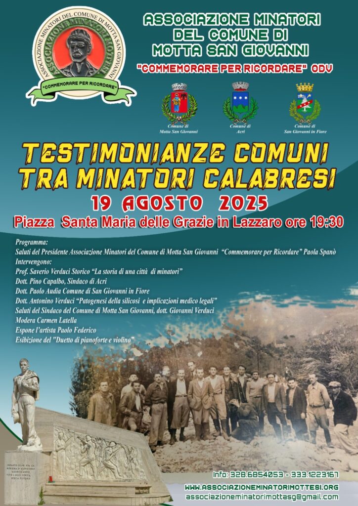 L’associazione “Minatori” del Comune di Motta San Giovanni ODV annuncia un evento che si terrà a Lazzaro il 19 agosto e vedrà la presenza dei rappresentanti dei Comuni di Acri, col Sindaco dr. Pino Capalbo, e di San Giovanni in Fiore, col dr. Paolo Audia, due comuni che hanno condiviso con quello di Motta San Giovanni una presenza molto forte di minatori negli anni 40-70 del secolo scorso nelle varie gallerie e miniere in Italia e in altre parti del mondo. L’evento, il primo del suo genere vuole mettere in comune le esperienze e le ricadute economico-sociali del sacrificio dei minatori nelle loro rispettive comunità.