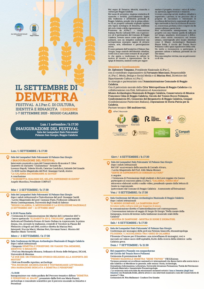 “Venerdì 29 agosto, alle ore 10:30, presso la Biblioteca G. Trisolini di Palazzo Alvaro, si terrà la conferenza-stampa di presentazione della prima edizione della rassegna di eventi culturali ‘Il Settembre di Demetra: Festival A.I.Par.C. di Cultura, Identità e Rinascita’. Saranno presenti, oltre al presidente A.I. Par.C. Salvatore Timpano, i massimi rappresentanti istituzionali del Comune e dei Settori coinvolti”. E’ quanto si legge in una nota del Comune di Reggio Calabria, che annuncia così l’evento.
