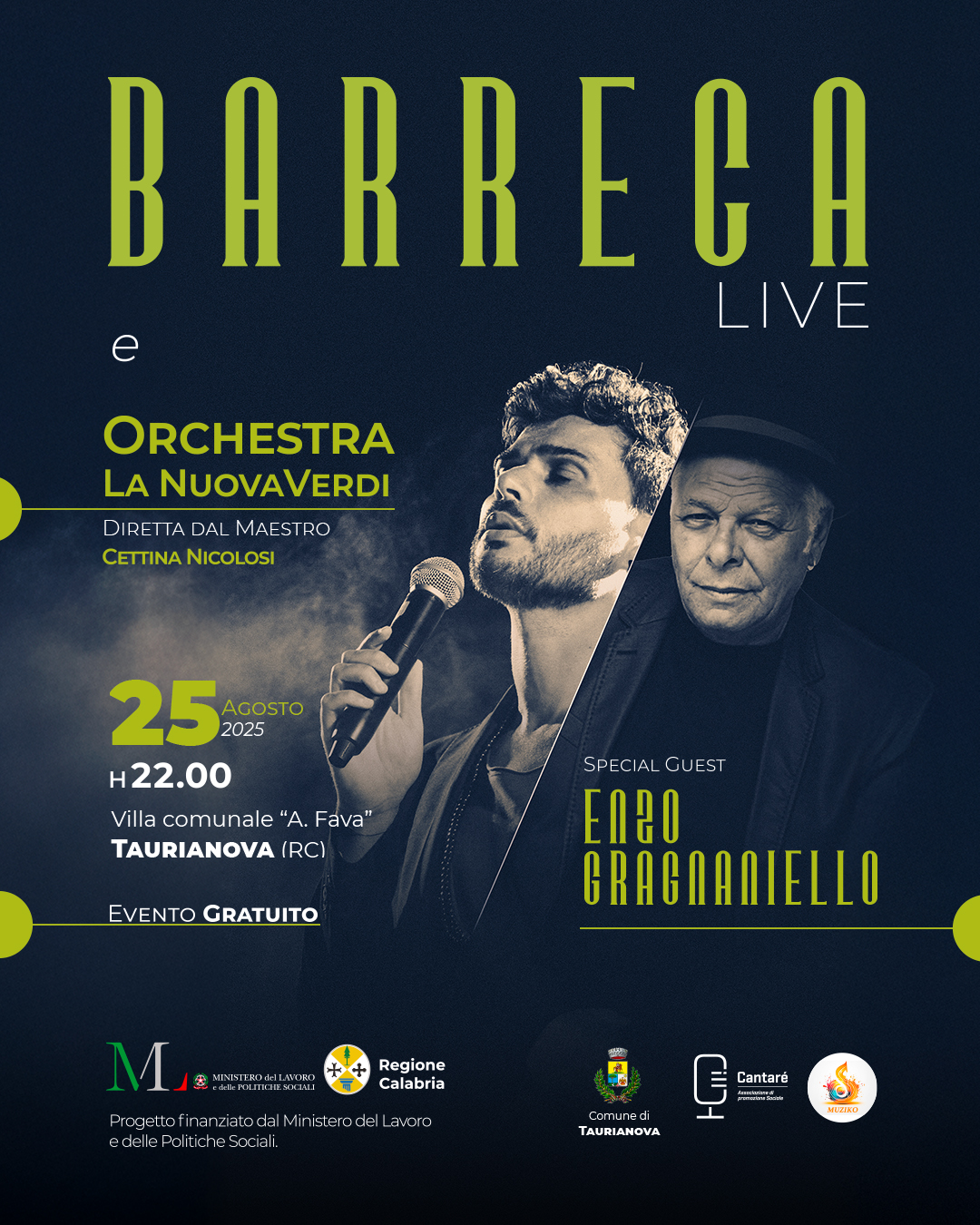 Sotto il cielo stellato di agosto, ritorna la grande musica dal vivo, in un evento speciale targato Cantaré. Il 25 agosto alle ore 22.00 a Taurianova, in programma il concerto pop sinfonico del cantautore Barreca e l’Orchestra La Nuova Verdi, impreziosito da un ospite d’eccezione, il noto e amatissimo cantautore Enzo Gragnaniello. La Villa comunale “A. Fava” sarà teatro di una serata imperdibile, ricca di emozioni e magia. L’appuntamento si inserisce nell’ambito del progetto, promosso dall’Associazione di promozione sociale Cantaré e finanziato dalla Regione Calabria e dal Ministero del Lavoro e delle Politiche Sociali, “Note di Inclusione – La Musica come Strumento di Integrazione”, un’iniziativa ampia e articolata finalizzata a promuovere, attraverso l’arte e la cultura, i valori dell’inclusione sociale, della cittadinanza attiva, della partecipazione e del volontariato, in sinergia con altre realtà associazionistiche, culturali e artistiche. L’evento gratuito si avvale del patrocinio del Comune di Taurianova e dell’Assessorato al Turismo, Eventi e Spettacolo e della collaborazione di Muziko.