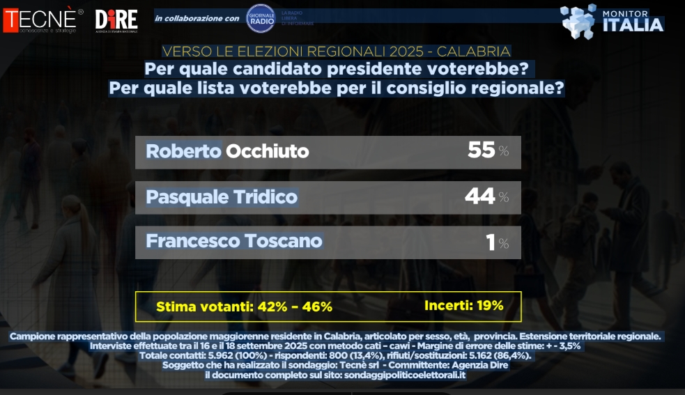 E’ entrata nel vivo la campagna elettorale in vista delle elezioni regionali in Calabria del prossimo 5 e 6 ottobre con i candidati che stanno girando in lungo ed in largo la regione. Secondo il sondaggio Dire-Tecnè, in collaborazione con Giornale Radio, con interviste effettuate tra il 16 e il 18 settembre, Roberto Occhiuto sarebbe davanti a Pasquale Tridico nella corsa alla guida della regione Calabria. Il 55% degli intervistati indica l’uscente di centrodestra, il 44% lo sfidante del centrosinistra. L’1% indica Francesco Toscano.