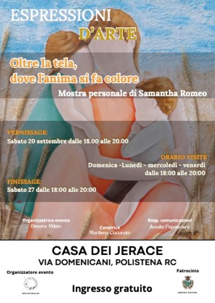 L’associazione di promozione sociale “Arte che Parla”, con il patrocinio del Comune di Polistena (R.C.), organizza, nell’ambito del progetto “Espressioni d’arte”, ideato dalla presidente e organizzatrice di eventi Simona Mileto, dalla socia e artista cosentina Marilena Cucunato, curatrice, e dalla socia Amalia Papasidero, responsabile della comunicazione, la mostra “Oltre la tela, dove l’anima si fa colore”, dell’artista Samantha Romeo.