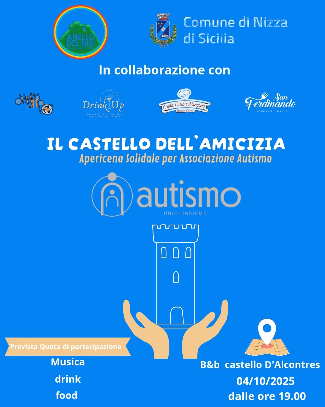 ‘Il Castello dell’Amicizia’: una serata tra musica e buon cibo per sostenere le attività dei laboratori di inclusione socio lavorativi del Centro per l’Autismo di Nizza di Sicilia. L’evento si svolgerà sabato 4 ottobre, dalle ore 19, nella storica e suggestiva e dimora del Castello d’Alcontres, organizzato dal Comune di Nizza di Sicilia insieme all’associazione Anello del Nisi. Il percorso gastronomico è firmato dalle cucine del ristorante ‘San Ferdinando’, da ‘Crudo, Cotto e Mangiato’ Coledi bistrot, e il supporto di ‘Di tutto un po’’ e ‘Drink up’. Una manifestazione che unisce la solidarietà e la sensibilizzazione verso i temi dell’autismo; un momento anche per ribadire il valore delle attività svolte sul territorio, a Messina e nella provincia, dalla struttura di Nizza di Sicilia.