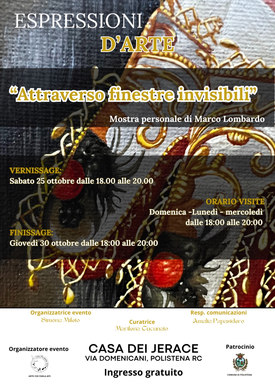 L’associazione di promozione sociale “Arte che Parla”, con il patrocinio del Comune di Polistena, cittadina in provincia di Reggio Calabria, organizza, nell’ambito del progetto “Espressioni d’arte”, ideato dalla presidente e organizzatrice di eventi Simona Mileto, dall’artista cosentina Marilena Cucunato, curatrice, e da Amalia Papasidero, responsabile della comunicazione, la mostra “Attraverso finestre invisibili”, dell’artista Marco Lombardo. Durante l’esposizione, il visitatore avrà modo di immergersi in un mondo sospeso in cui presente e passato si guardano negli occhi: le tele di Marco Lombardo attraverso i volti, le mani, i corpi immersi nella luce che sembrano emergere da un tempo indefinito, ci raccontano la bellezza classica che si rinnova in una dimensione intima e contemporanea.