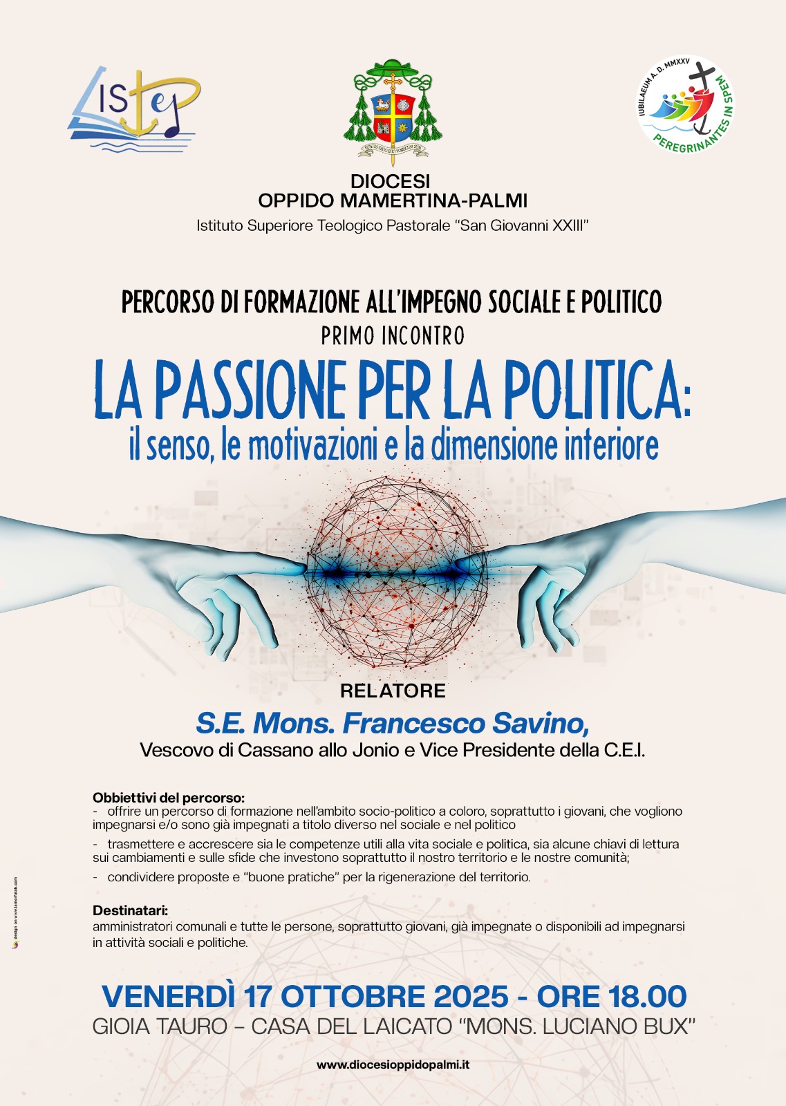 Prenderà il via domani, venerdì 17 ottobre 2025, a Gioia Tauro presso la Casa del Laicato “Mons. Luciano Bux”, il nuovo percorso di formazione all’impegno sociale e politico promosso dall’Osservatorio Pastorale socio-religioso, guidato da don Pino Demasi. L’iniziativa nasce con l’obiettivo di offrire uno spazio di riflessione, confronto e crescita a quanti desiderano impegnarsi con responsabilità nella vita pubblica, alla luce dei valori evangelici e della Dottrina sociale della Chiesa. Ad aprire il ciclo sarà Mons. Francesco Savino, Vescovo di Cassano allo Jonio e Vice Presidente della Conferenza Episcopale Italiana, con un intervento dal titolo “La passione per la politica: il senso, le motivazioni e la dimensione interiore”.
