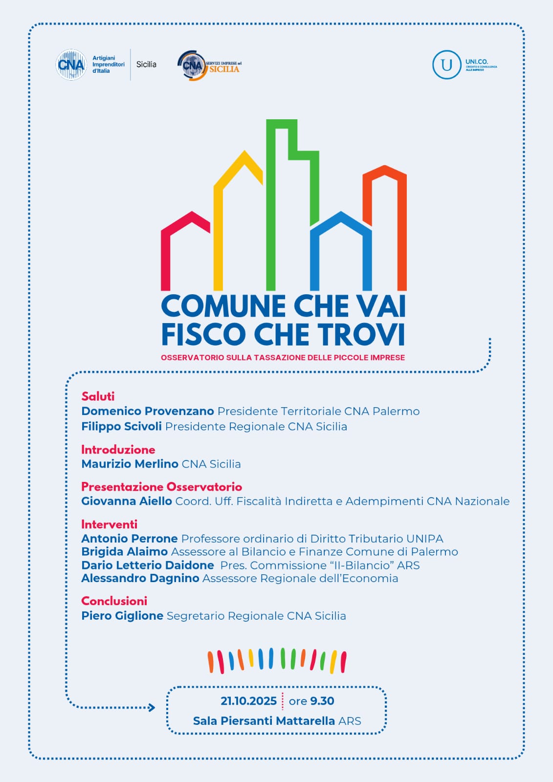 CNA Sicilia presenterà il Rapporto “Comune che vai, fisco che trovi”, realizzato dall’Osservatorio sulla tassazione delle piccole imprese del Dipartimento politiche fiscali e societarie di CNA. L’evento, dedicato alle dinamiche fiscali che interessano le realtà imprenditoriali più piccole del territorio, si terrà lunedì 21 ottobre 2025, alle ore 9.30, presso la Sala Piersanti Mattarella dell’Assemblea Regionale Siciliana a Palermo.