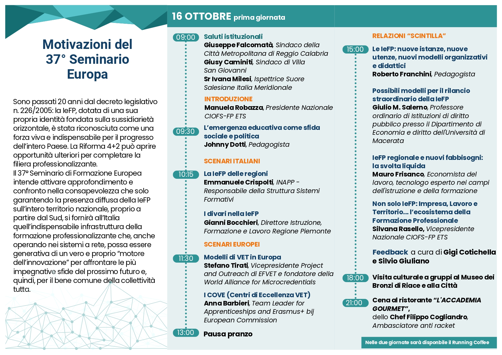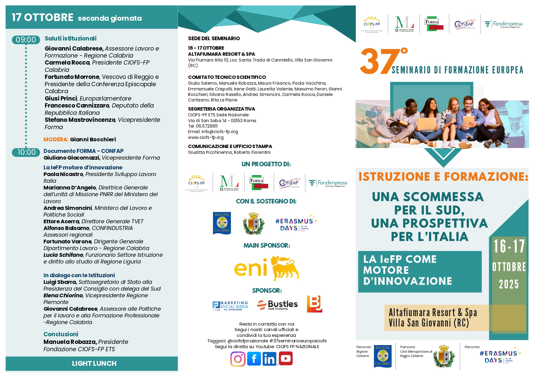 La seconda giornata di lavori si aprirà con i saluti istituzionali di Fortunato Morrone, Arcivescovo di Reggio-Bova e presidente della Conferenza Episcopale Calabra; Carmela Rocca, presidente CIOFS/FP Calabria ETS; Stefano Mastrovincenzo, vicepresidente di FORMA; Giusi Princi, europarlamentare e membro della Commissione per la Cultura e l’Istruzione; e Francesco Cannizzaro, membro della Camera dei Deputati. Modera Gianni Bocchieri. Seguirà la presentazione del documento FORMA-CONFAP con Giuliano Giacomazzi. L’ultimo panel sarà dedicato a “La IeFP sulla Riforma 4+2”, con la partecipazione di Paola Nicastro, presidente di Sviluppo Lavoro Italia; Marianna D’Angelo, direttrice generale dell’Unità di Missione PNRR del Ministero del Lavoro; Andrea Simoncini, Ministero del Lavoro e delle Politiche Sociali; Ettore Acerra, direttore generale TVET; Alfonso Balsamo, Confindustria; Fortunato Vallone, dirigente generale del Dipartimento Lavoro della Regione Calabria; e Lucia Schifano, funzionaria del settore Istruzione e diritto allo studio della Regione Liguria. Chiuderà questa 37ª edizione del Seminario un incontro a dialogo con le istituzioni, al quale è annunciata la presenza di Luigi Sbarra, Sottosegretario di Stato alla Presidenza del Consiglio con delega al Sud; Elena Chiorino, vicepresidente della Regione Piemonte; e Giovanni Calabrese, assessore alle Politiche per il Lavoro e alla Formazione Professionale della Regione Calabria. Le conclusioni saranno a cura di Manuela Robazza, presidente nazionale del CIOFS-FP.