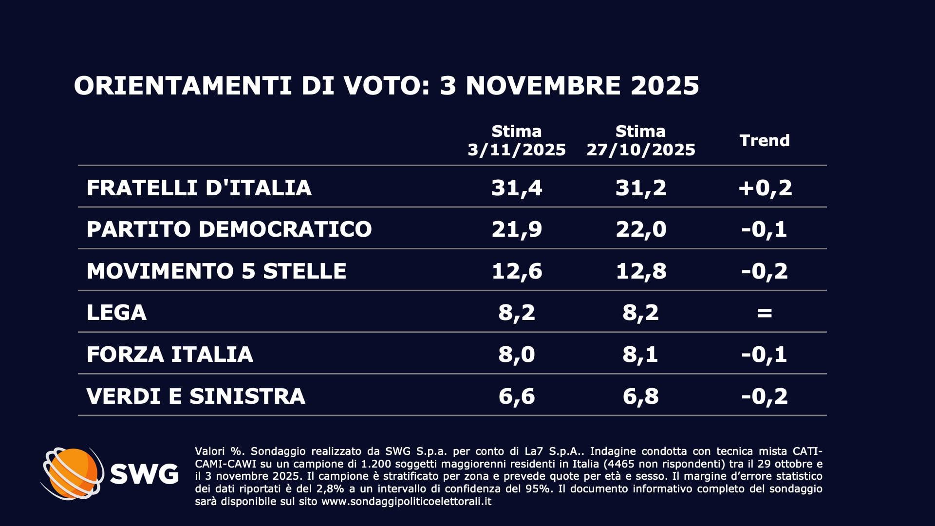 A tre settimane dalle elezioni regionali in Campania, Veneto e Puglia, i vari partiti sono in piena campagna elettorale. Per il sondaggio Swg per il Tg La7 al primo posto resta Fratelli d’Italia che guadagna lo 0,2% e sale al 31,4%. Il Partito Democratico cede lo 0,1% e scende al 21,9%. Cala anche il Movimento 5 Stelle, che perde lo 0,2% e ora è al 12,6%. Stabile la Lega all’8,2% mentre Forza Italia lascia sul terreno lo 0,1% e scende all’8%. Giù anche l’Alleanza Verdi – Sinistra (-0,2%) al 6,6%.