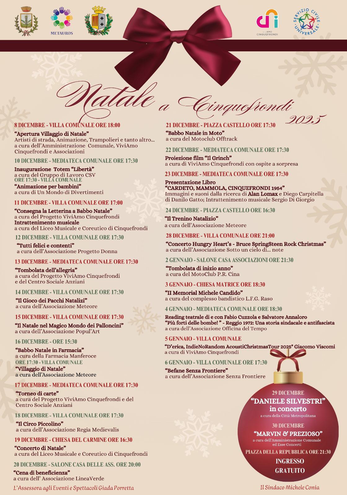 “Per tutte le festività la città si trasformerà in un palcoscenico diffuso di allegria, cultura, musica e tradizione. Un invito aperto a tutti i cittadini e ai visitatori dei territori limitrofi a partecipare, condividere e vivere insieme la magia del Natale”, conclude la nota.