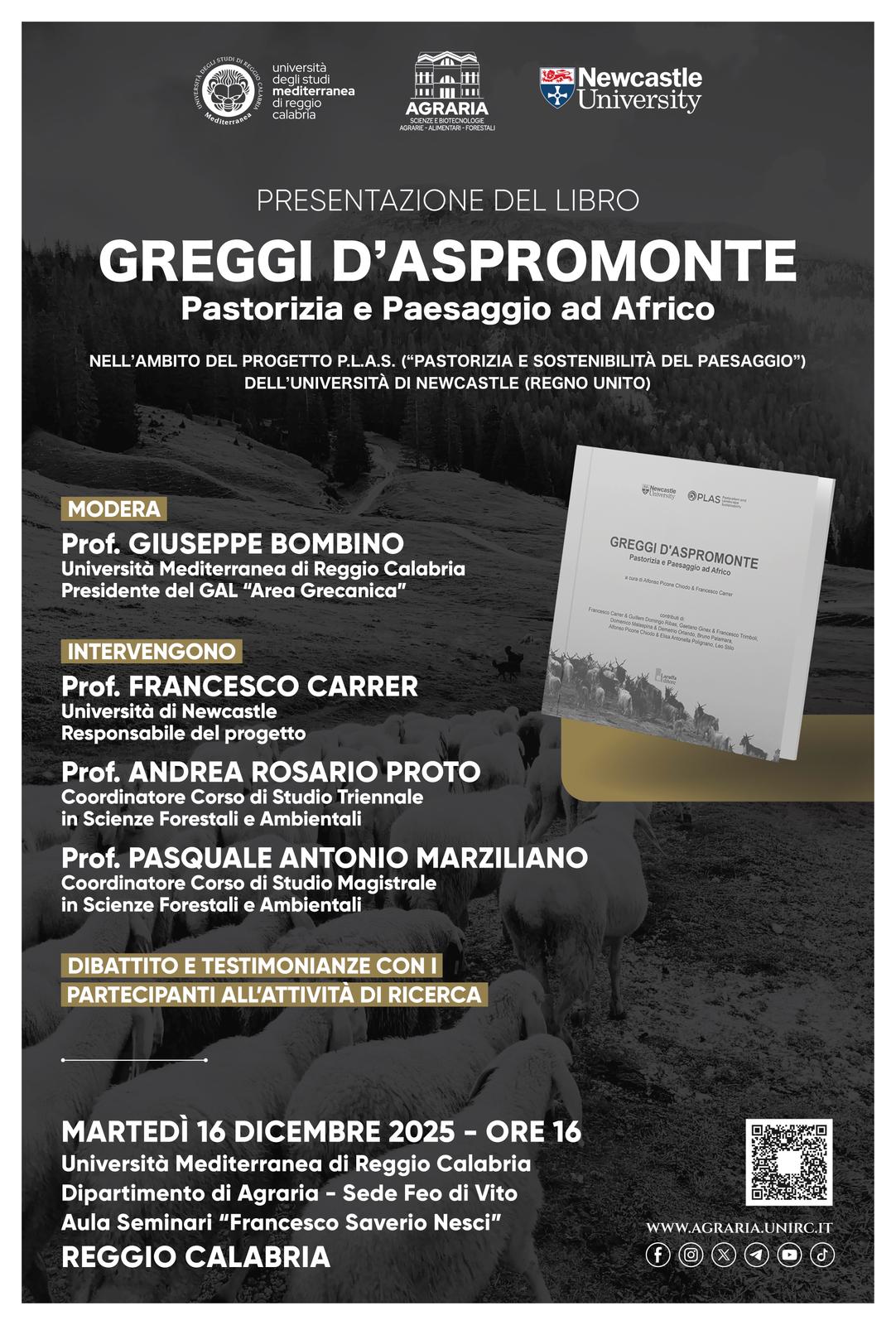 Il secondo evento si terrà martedì 16 dicembre 2025, alle ore 16.00, presso il Dipartimento di Agraria dell’Università Mediterranea di Reggio Calabria. Moderato dal Prof. Giuseppe Bombino, l’incontro ospiterà gli interventi del gruppo di ricerca coinvolto nel progetto P.L.A.S., con una riflessione condivisa sul rapporto tra pastorizia, paesaggio e gestione sostenibile delle zone montane. Le due iniziative rappresentano un’importante occasione di confronto tra comunità scientifica e comunità locale, mirata alla valorizzazione di un patrimonio culturale e ambientale che continua a modellare l’identità dell’Aspromonte.