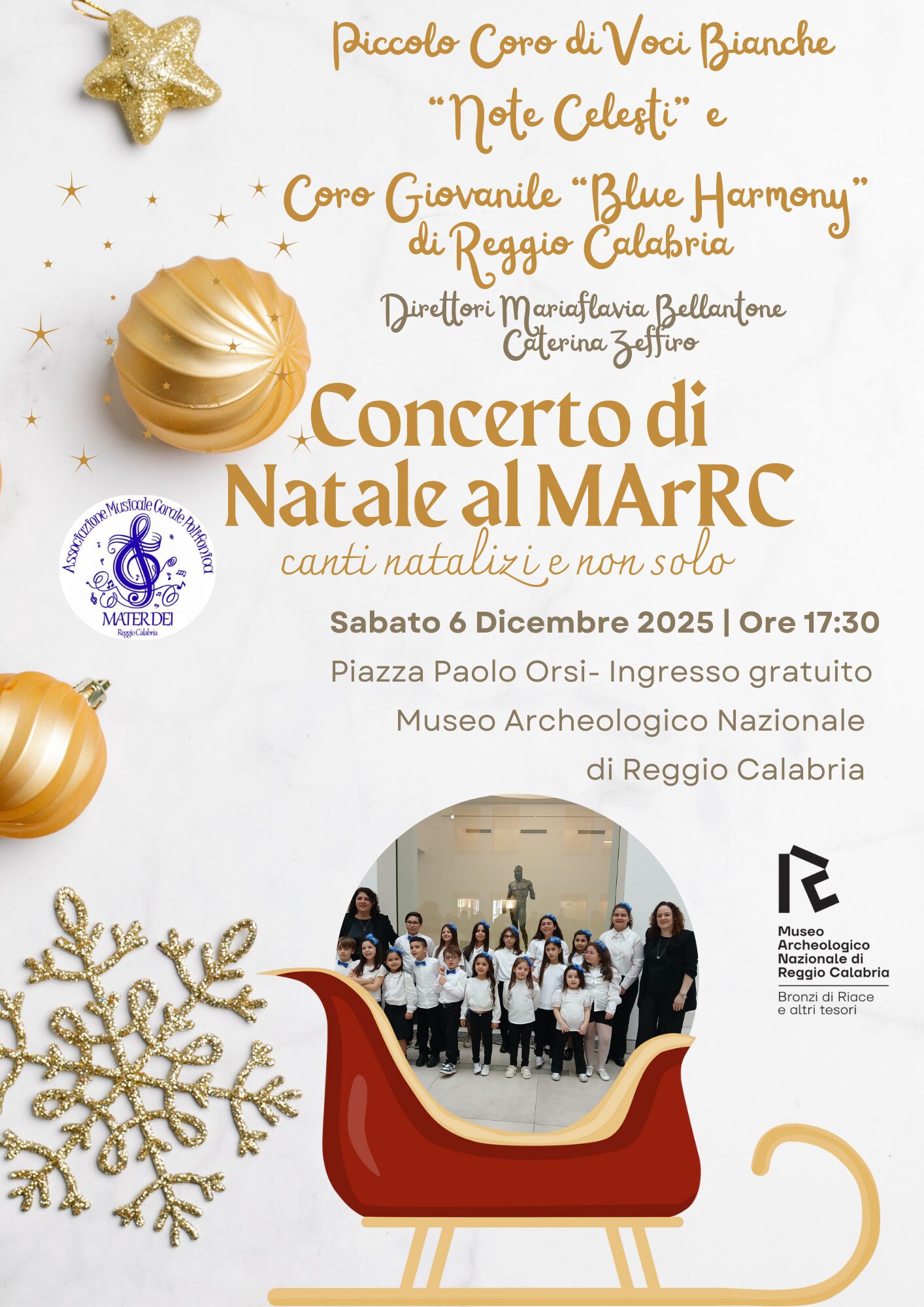 In occasione dell’inizio della stagione natalizia, ritorna l’appuntamento con la musica del Natale al Museo Archeologico Nazionale di Reggio Calabria. Sabato 6 dicembre 2025 alle ore 17.30, presso la piazza Paolo Orsi, “grazie alla grande disponibilità che l’istituzione museale ha sempre manifestato nei confronti della cultura in tutte le sue forme, e la musica in particolare, l’Associazione Musicale Corale Polifonica Mater Dei di Reggio Calabria organizza un concerto con il suo Piccolo Coro di Voci Bianche Note Celesti, che vede coinvolti bambini dai cinque ai dodici anni ed il Coro Giovanile Blue Harmony, che è nato di recente per nato per dare autonomia alla fascia giovanile fra i tredici ed i diciannove anni” si legge in una nota dell’Associazione Musicale.