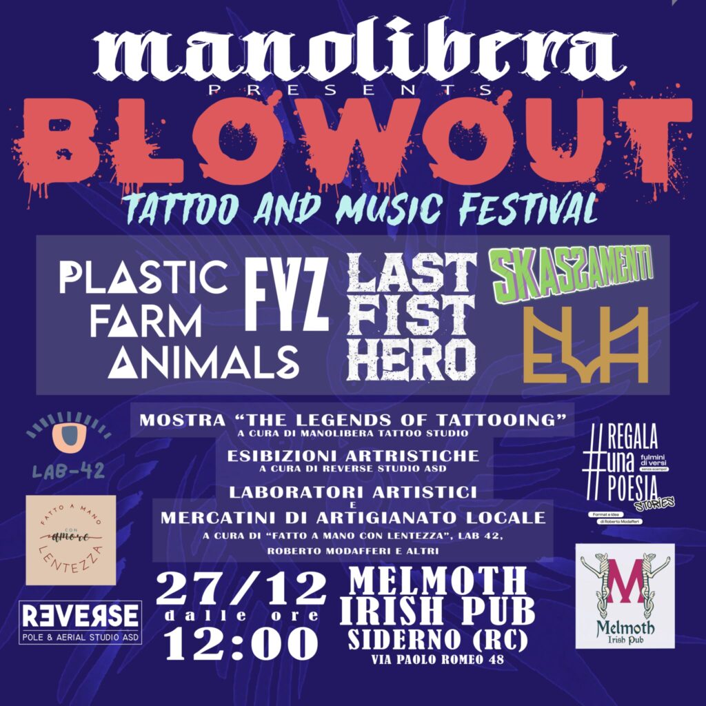 Il percorso si chiude il 27 dicembre a Siderno con uno degli appuntamenti più articolati del mese: il Blowout Tattoo and Music Festival, ospitato dal Melmoth Irish Pub a partire dalle ore 12:00. Una giornata che unisce concerti, tatuaggio, arti visive, laboratori artistici e mercatini di artigianato locale. Grazie a Manolibera Tatoo Studio, sul palco e negli spazi del festival si alterneranno band come Plastic Farm Animals, FYL, Last Fist Hero e Skassamenti, mentre la poesia trova spazio all’interno di un contesto multidisciplinare. In questa occasione Roberto Modafferi presenterà il suo libro e ricoprirà anche il ruolo di MC, accompagnando il pubblico lungo l’intero evento.