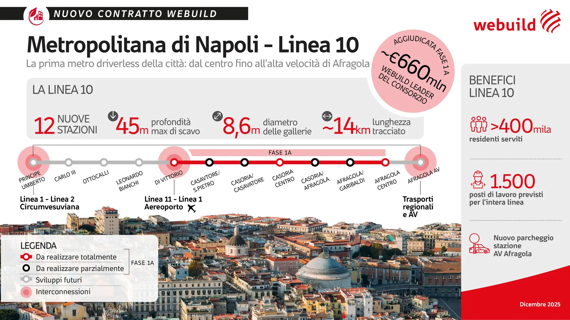 Webuild, in consorzio, ha vinto un contratto da circa 660 milioni di valore totale per la realizzazione di una prima tratta del Lotto 1 della nuova Linea 10 della metropolitana di Napoli. Il lotto è parte di un più ampio progetto che prevede un investimento complessivo stimato di oltre €3,1 miliardi, destinato a rivoluzionare la mobilità nell’area nord-orientale della città. La Linea 10 sarà driverless e permetterà a regime ad oltre 400.000 cittadini di usufruire di un collegamento rapido e sostenibile con il centro città e con la rete dell’alta velocità ferroviaria.