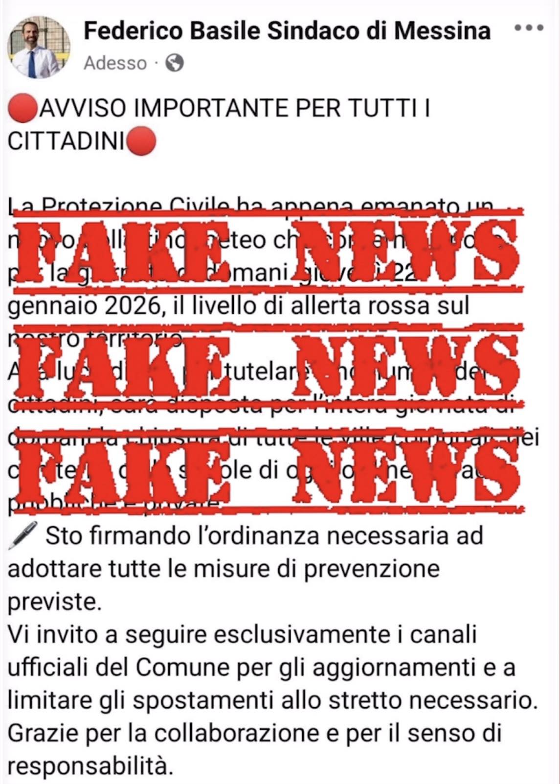 “Invito tutti a ignorare queste fake news e a fidarsi solo dei canali istituzionali del Comune di Messina per informazioni ufficiali e verificate. Chi alimenta il caos con queste bufale si assume una responsabilità gravissima”, conclude Basile.