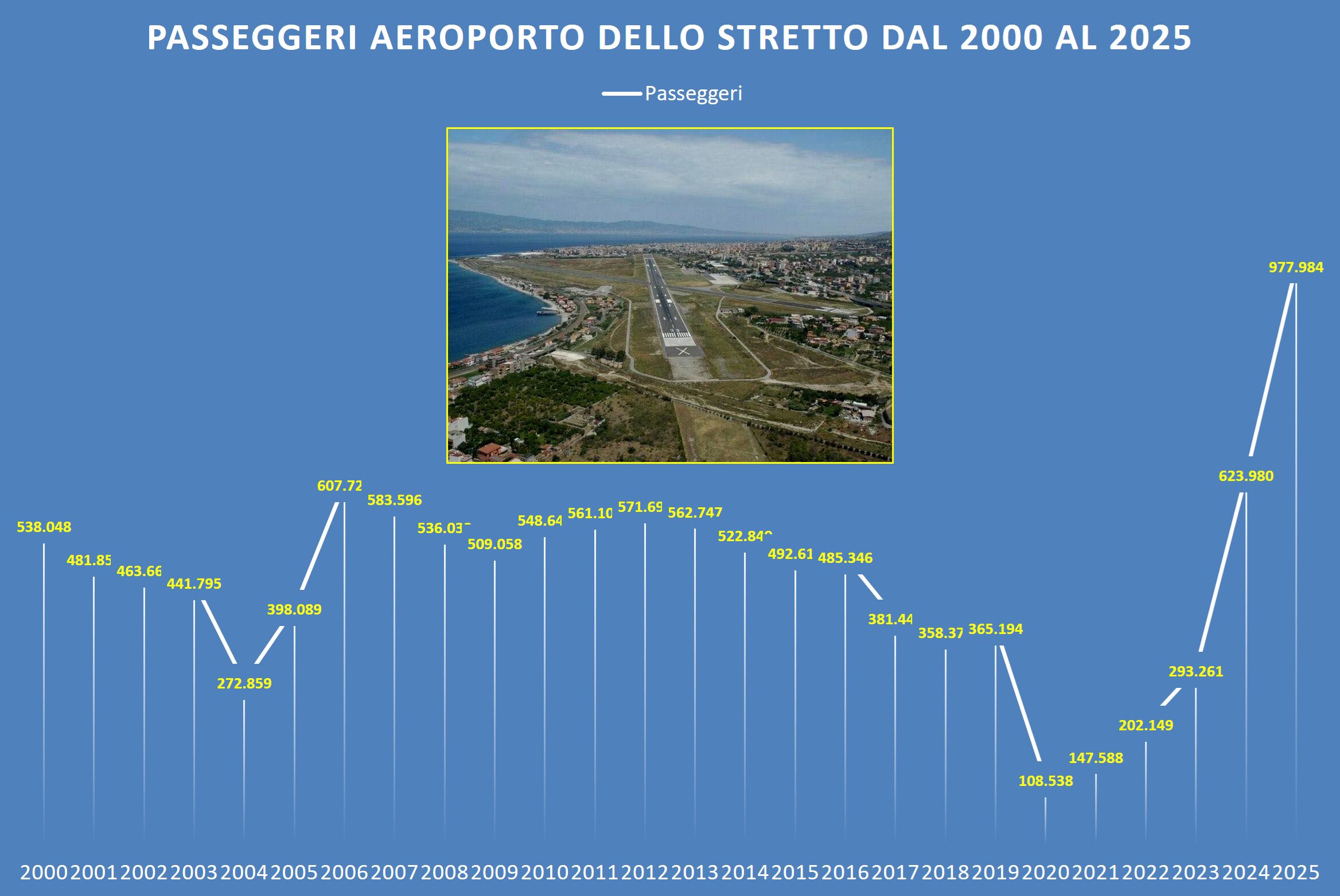 Sono ufficiali i dati del traffico passeggeri definitivi per il 2025 negli aeroporti italiani, e sono eccezionali per quanto riguarda l’Aeroporto di Reggio Calabria. Lo scalo dello Stretto, infatti, ha segnato il suo record storico assoluto sfiorando il milione di passeggeri annui, un dato assolutamente impensabile in tutta la storia del Tito Minniti. Il numero esatto dei passeggeri transitati all’Aeroporto di Reggio Calabria nel 2025 è di 977.984, in crescita del +56,7% rispetto al 2024 ma soprattutto in crescita del +333,5% rispetto al 2023, due anni fa, quando i passeggeri annui erano stati appena 293.261. Quello che due anni fa era uno degli Aeroporti peggiori d’Italia, adesso è da due anni consecutivi quello che cresce in assoluto di più nel nostro Paese e ha raggiunto la soglia psicologica del milione di passeggeri che lo rende uno scalo in piena operatività e funzionalità.