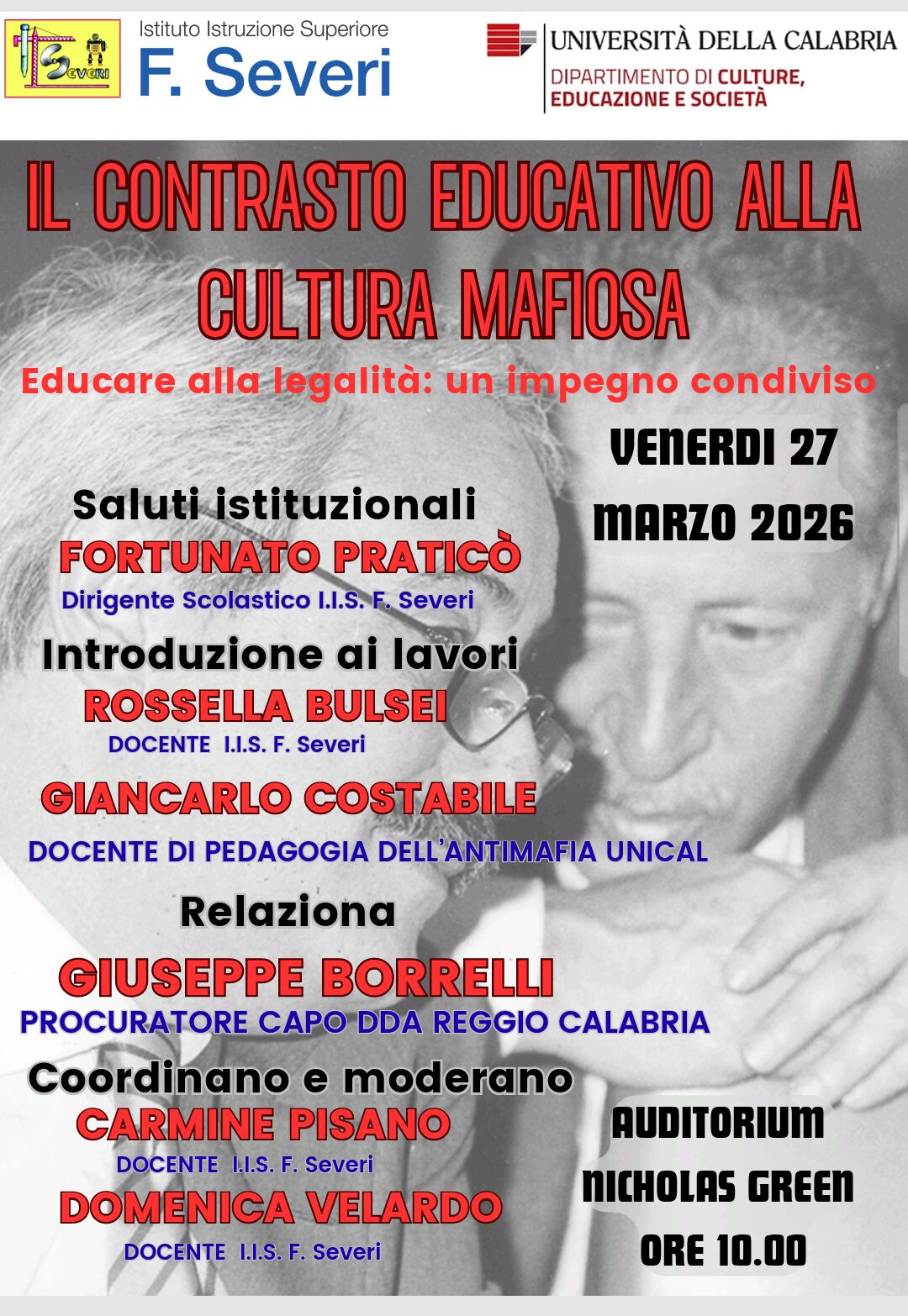 Domani, venerdì 27 marzo, l’Auditorium “Nicholas Green” dell’I.I.S. “F. Severi” di Gioia Tauro ospiterà un’iniziativa di alto valore civile e formativo dal titolo “Il contrasto educativo alla cultura mafiosa. Educare alla legalità: un impegno condiviso”. Un titolo che va oltre la dimensione evocativa per configurarsi come una vera e propria dichiarazione di metodo: la legalità intesa non come principio astratto, ma come pratica quotidiana, responsabilità collettiva e costruzione culturale condivisa.