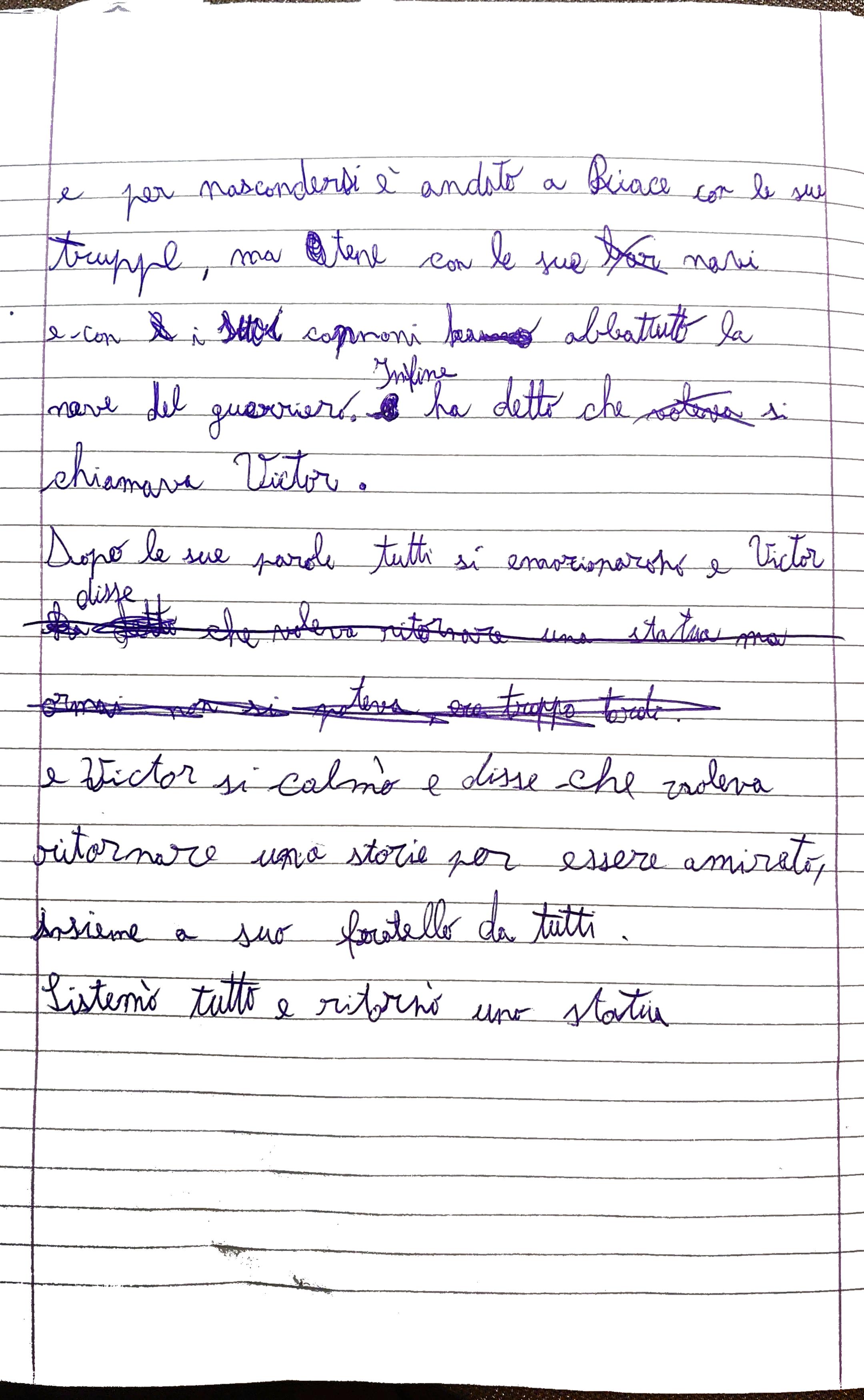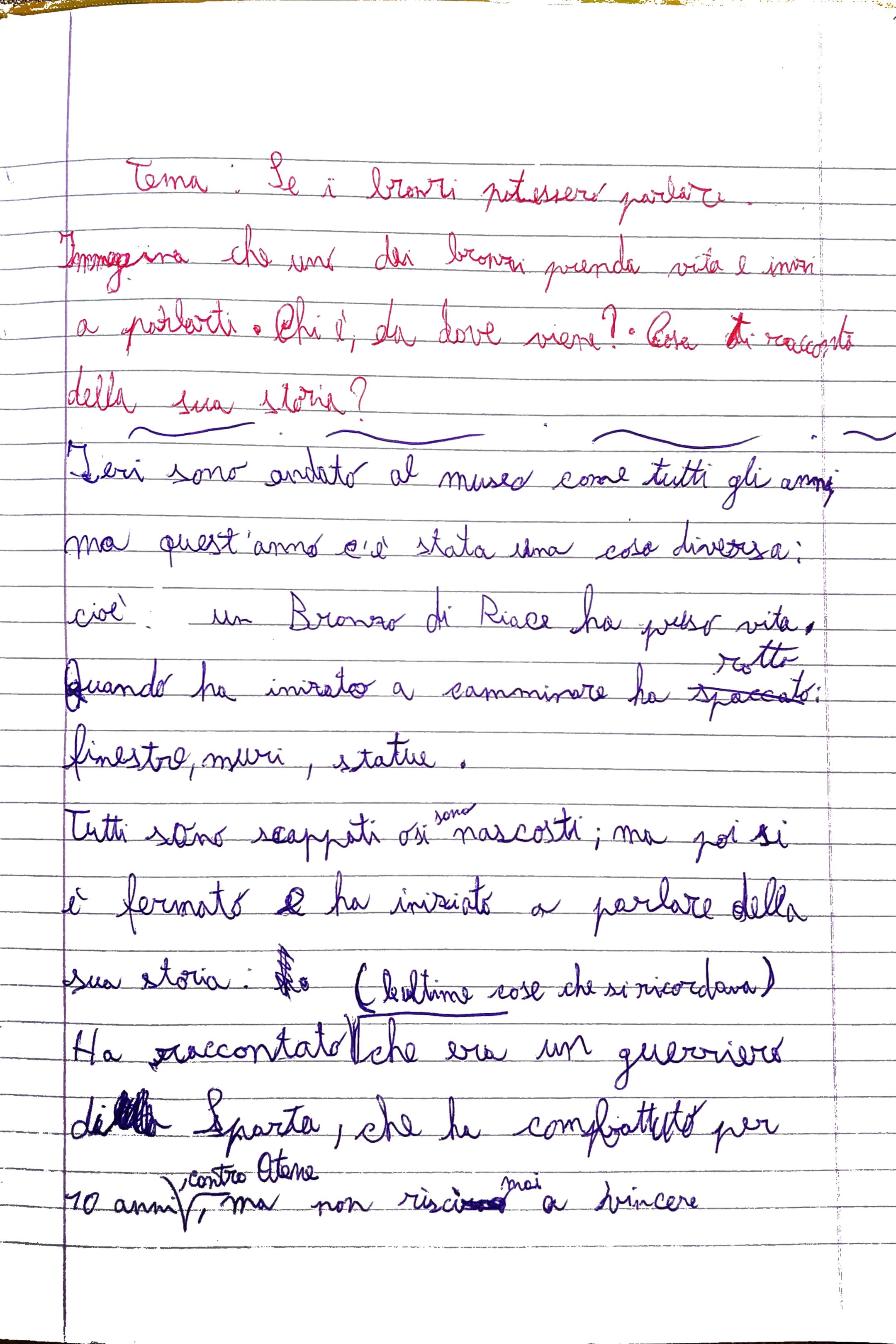 “Ieri sono andato al museo come ogni anno. Quest’anno c’è stata una cosa diversa : cioè un bronzo di Riace ha preso vita. Quando ha iniziato a camminare ha rotto finestre, muri e statue. Tutti sono scappati o nascosti ma poi si è fermato e ha iniziato a raccontare le ultime cose che si ricordava. Ha raccontato che era un guerriero di Sparta , che ha combattuto per 10 anni contro Atene ma non riuscì mai a vincere e per nascondersi è andato a Riace con le sue truppe: ma Atene con le sue navi e con i suoi cannoni ha affondato la nave del guerriero. Infine ha detto che si chiamava Victor. Dopo le sue parole tutti si emozionarono e Victor si calmò e disse che voleva ritornare una statua per essere ammirato insieme a suo fratello, da tutti. Sistemò tutto e ritornò una Statua”.