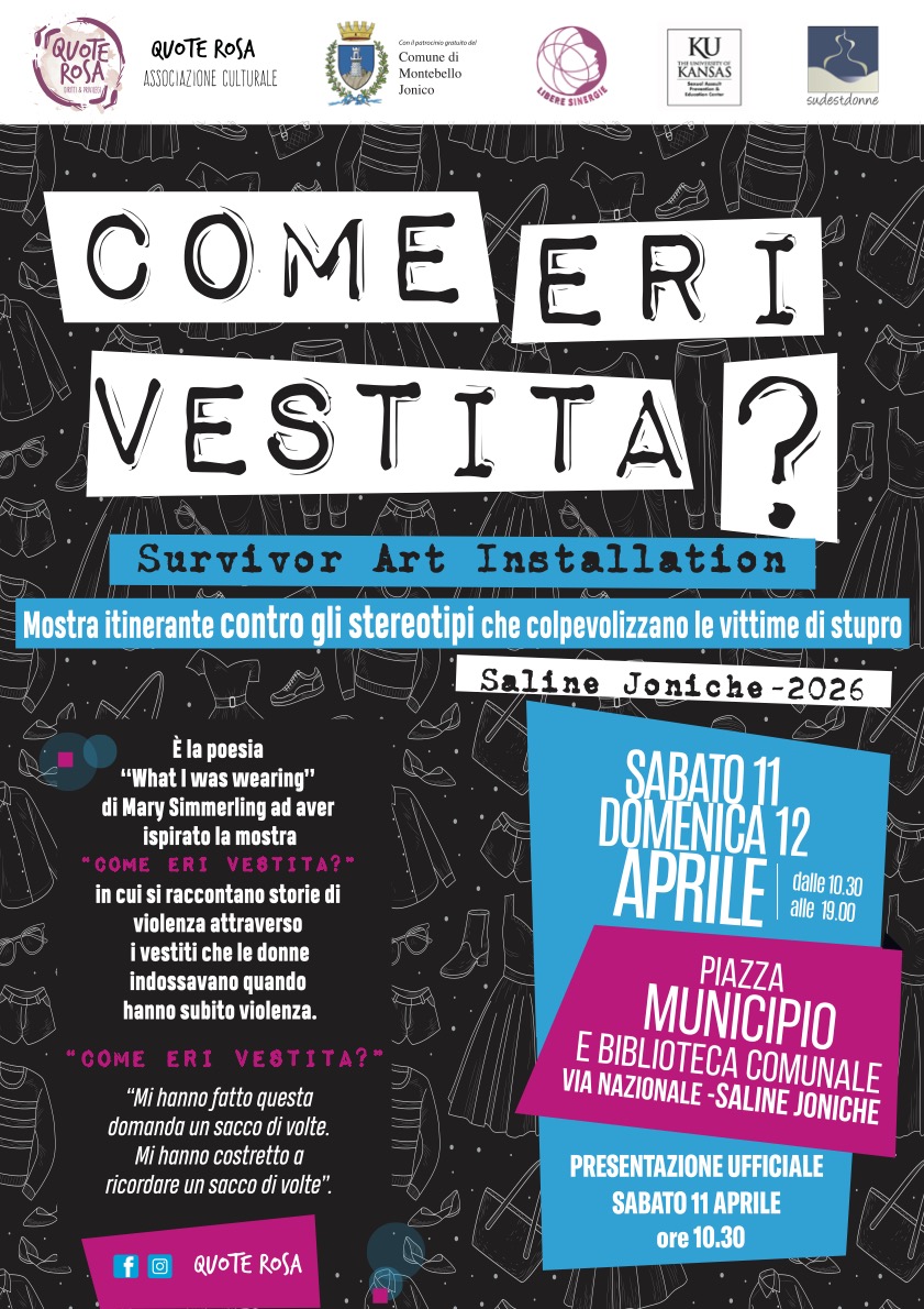 A Saline Joniche prende forma un appuntamento culturale dal forte valore simbolico e sociale: sabato 11 e domenica 12 aprile la Delegazione municipale e la biblioteca comunale di via Nazionale ospiteranno “Come eri vestita?”: la Survivor art installation che affronta in modo diretto e coinvolgente il tema della violenza di genere e degli stereotipi legati alla colpevolizzazione delle vittime di stupro. L’iniziativa sarà inaugurata ufficialmente sabato 11 aprile alle ore 10.30 e resterà aperta al pubblico per due giornate, offrendo alla comunità uno spazio di riflessione, ascolto e consapevolezza.