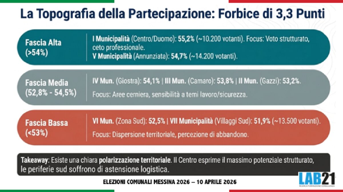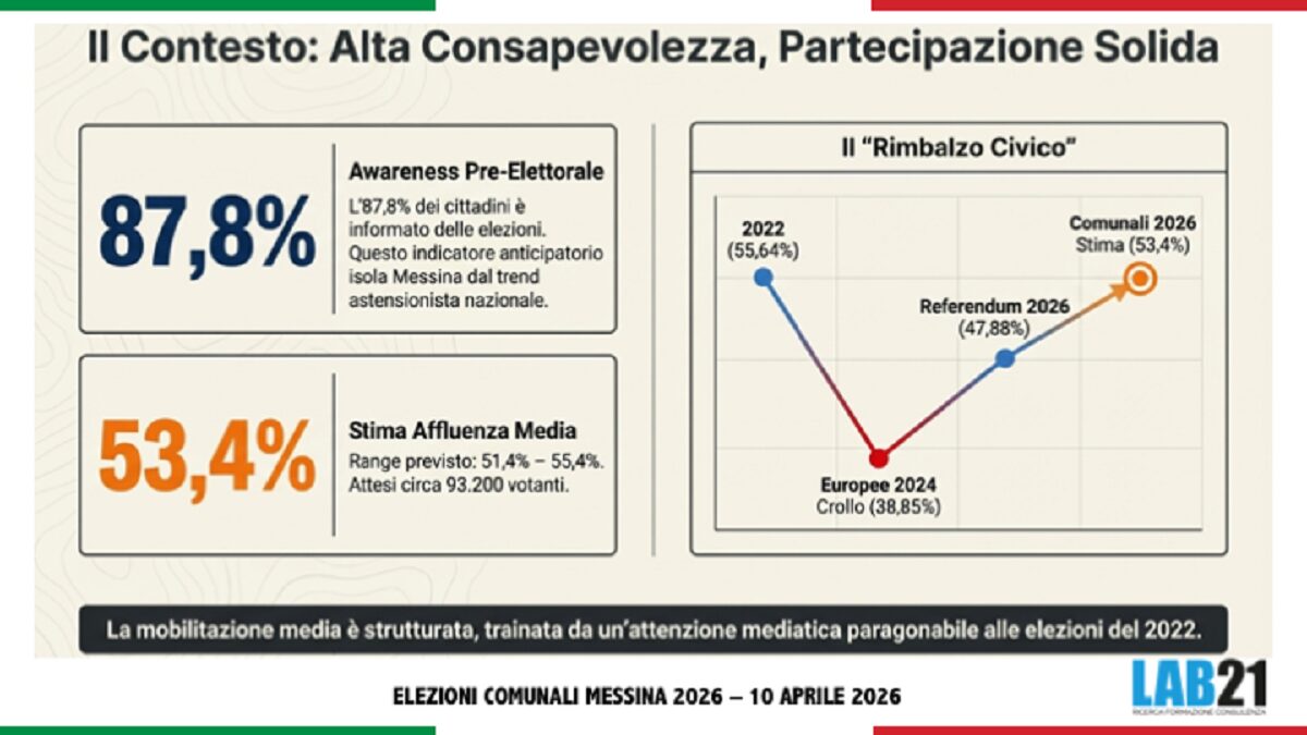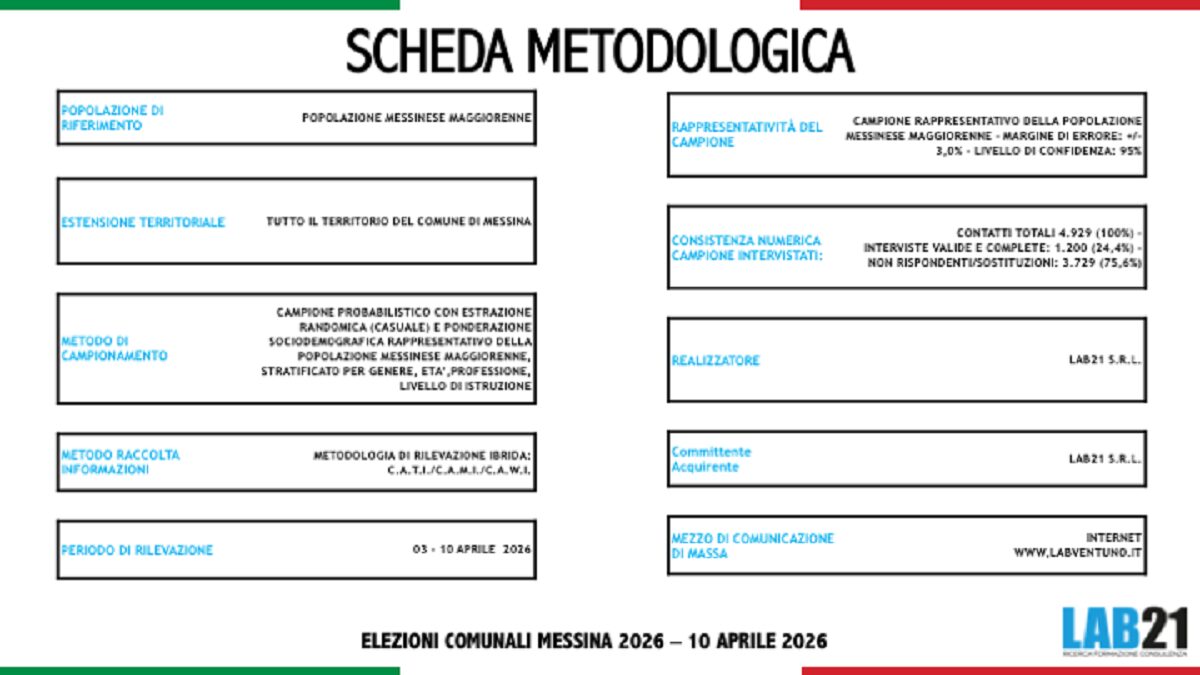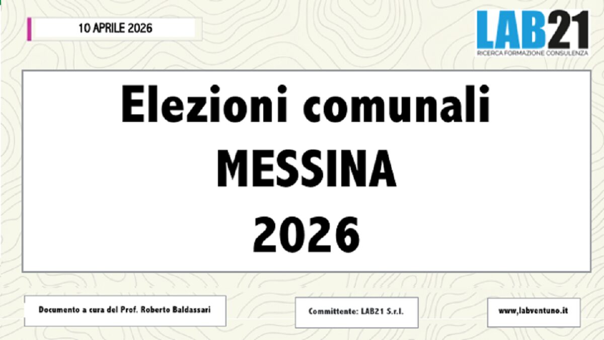 Il documento di Lab21 sottolinea: “la fotografia demoscopica di Messina 2026 è quella di una competizione con un favorito netto e un’opposizione che non ha ancora trovato, o non troverà in tempo, una sintesi unitaria. Il profilo di Basile è tra i più solidi registrati in una rilevazione pre-elettorale locale: la convergenza tra conoscenza, fiducia e propensione al voto non lascia spazio a molte interpretazioni alternative. Eppure, anche in contesti apparentemente definiti, la demoscopia insegna prudenza: le variabili di mobilitazione, la qualità dell’ultima settimana di campagna e l’eventuale effetto sorpresa di dinamiche locali non rilevabili con gli strumenti quantitativi possono sempre introdurre elementi di imprevedibilità. Il dato che rimane: Messina 2026 è, in questo momento, una partita con un protagonista molto solido e un campo dell’alternativa ancora alla ricerca di se stesso”.