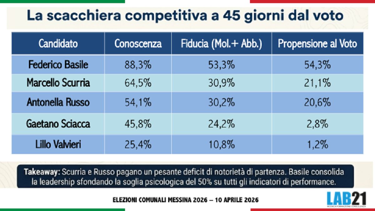 Primo sondaggio politico sulle elezioni comunali di Messina dove infiamma la campagna elettorale tra tensioni, botte e risposte e proposte. Secondo un rilevamento di Lab21, Federico Basile (sindaco uscente) presenta “un profilo demoscopico di rara consistenza interna. Con una conoscenza dell’88,3%, una fiducia del 53,3% e, soprattutto, una propensione al voto del 54,3%, Basile non si limita a guidare la competizione: la domina. La coerenza tra i tre parametri è il dato più rilevante: quasi tutti coloro che lo conoscono gli riconoscono fiducia, e la maggioranza di costoro traduce questa fiducia in intenzione di voto. Si tratta di un profilo di consenso solido, maturo, difficilmente erodibile in una campagna breve. Il vantaggio strutturale è qui amplificato da un gradimento personale che supera la metà del campione, una combinazione rara nelle competizioni locali italiane degli ultimi anni”.