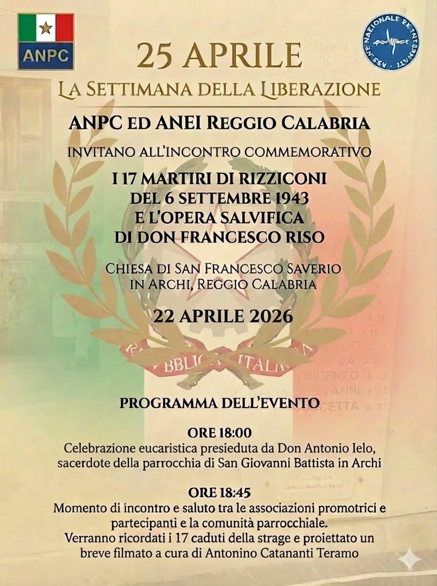 L’iniziativa intende inoltre valorizzare la figura di Don Francesco Riso, la cui azione pastorale e umana fu segnata da un impegno concreto di vicinanza e sostegno alle comunità colpite, contribuendo alla conservazione della memoria di quei tragici eventi. L’incontro si terrà il 22 aprile 2026 presso la Chiesa di San Francesco Saverio in Archi, Reggio Calabria, e si inserisce nel programma delle celebrazioni della Settimana della Liberazione. L’iniziativa è promossa da ANPC e ANEI Reggio Calabria in collaborazione con la comunità parrocchiale.