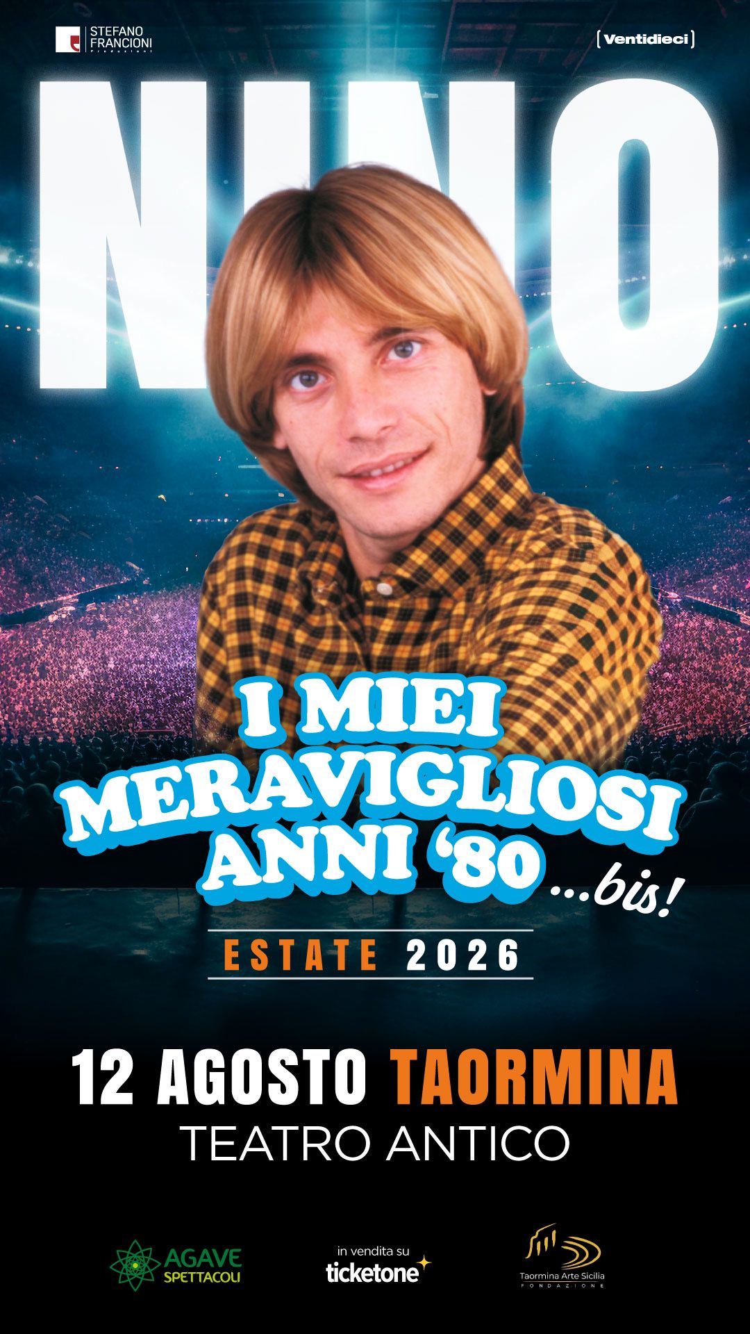 Si chiama “I miei meravigliosi anni ’80…bis” il concerto con il quale il cantautore napoletano per eccellenza Nino D’Angelo celebrerà i suoi 50 anni di carriera. Una cifra tonda, che coincide con una grande festa della musica, che Nino D’Angelo condividerà con i fan siciliani. Due le date previste in Sicilia nel mese di agosto: mercoledì 12 agosto al Teatro Antico di Taormina e giovedì 13 agosto al Teatro di Verdura di Palermo. Inizio ore 21:00. Il tour è prodotto dalla ‘Stefano Francioni Produzioni’ ed è distribuito in Sicilia da Ventidieci e dalla Agave Spettacoli di Andrea Randazzo. La tappa di Taormina è organizzata in collaborazione con Fondazione Taormina Arte Sicilia. Da oggi al via la prevendita su www.ticketone.it e nei circuiti locali autorizzati.