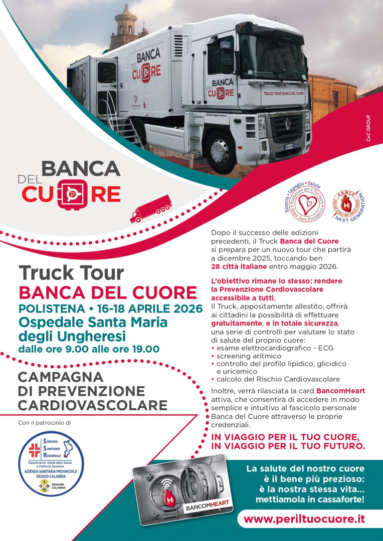 “Prosegue l’impegno dell’Azienda sanitaria provinciale di Reggio Calabria per la promozione della salute e la cultura della prevenzione. Dal 16 al 18 aprile, presso l’ospedale di Polistena, sarà presente il Truck della prevenzione cardiovascolare nell’ambito del progetto “Banca del Cuore – Truck Tour”, promosso dalla Fondazione per il Tuo Cuore – ANMCO (Associazione Nazionale Medici Cardiologi Ospedalieri), ideato e coordinato dal Prof. Michele Massimo Gulizia”. È quanto si legge in una nota dell’Azienda sanitaria provinciale di Reggio Calabria.