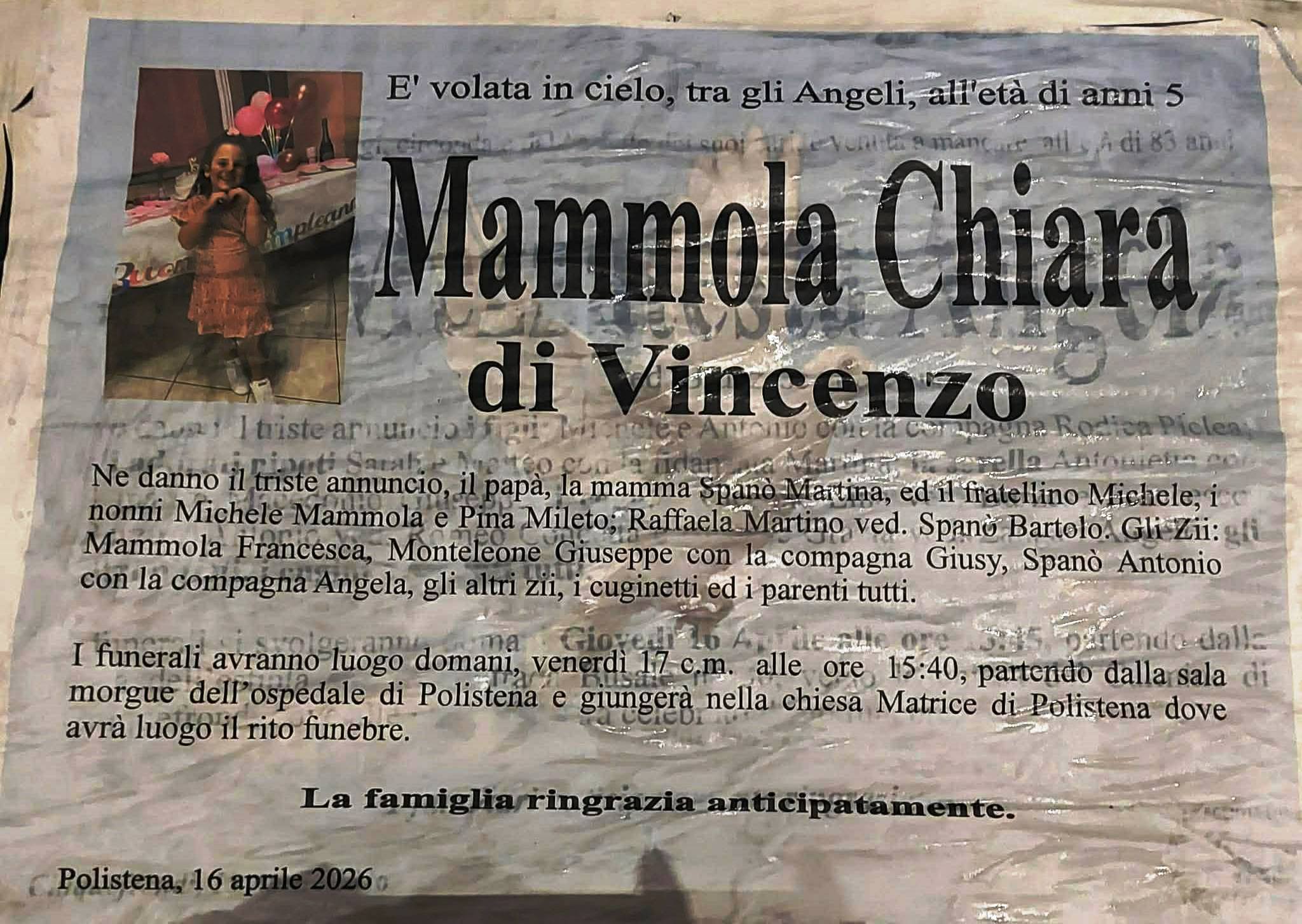 Attraverso il manifesto funebre, i genitori, insieme al fratellino, ai nonni e a tutti i parenti, hanno annunciato con immenso dolore la scomparsa della loro amata Chiara. I funerali si terranno domani, venerdì 17 aprile, alle ore 15:40. Il corteo funebre partirà dalla sala mortuaria dell’ospedale di Polistena per raggiungere la Chiesa Matrice, dove sarà celebrato il rito religioso.