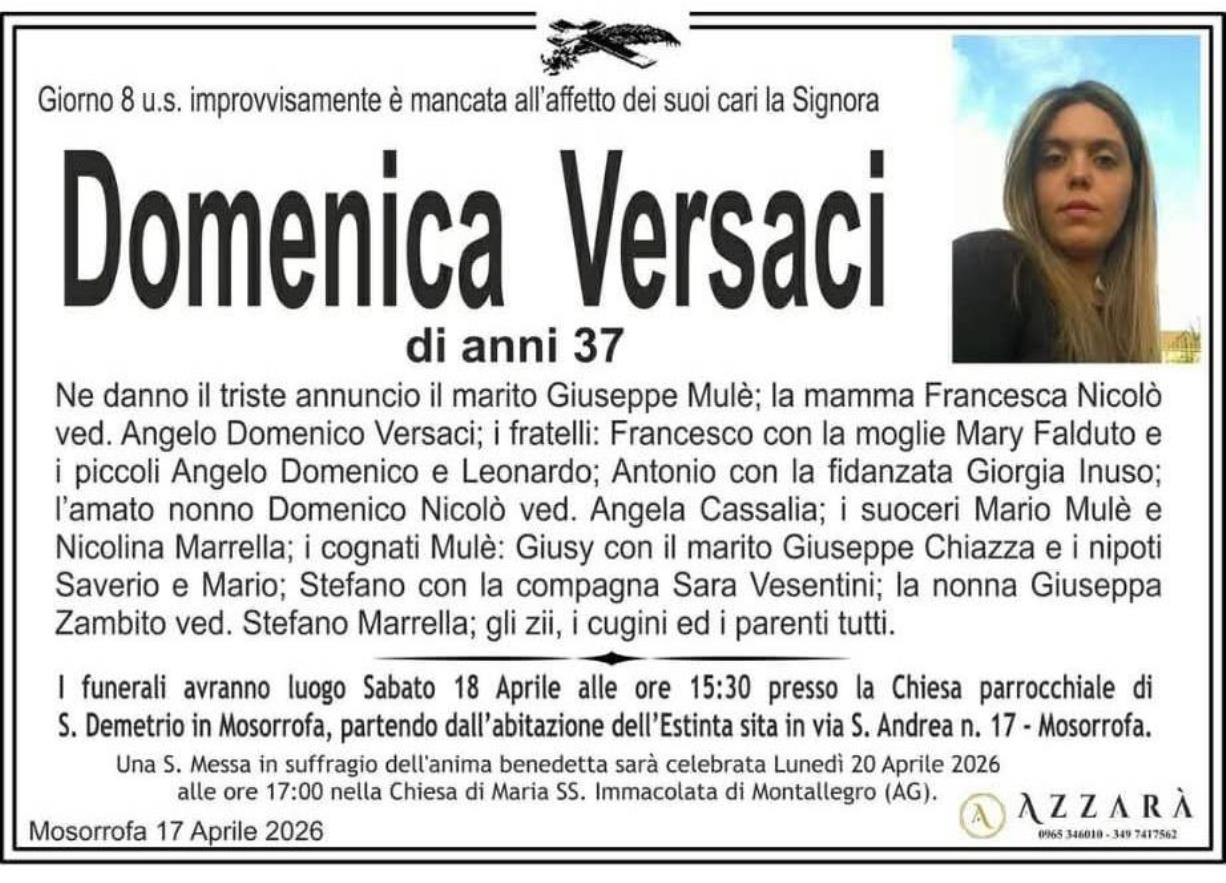 Profondo cordoglio a Reggio Calabria per l’improvvisa scomparsa di Domenica Versaci, 37 anni, venuta a mancare nei giorni scorsi lasciando nello sconforto la sua famiglia e l’intera comunità. La notizia, diffusa anche attraverso il manifesto funebre, ha rapidamente fatto il giro della città, suscitando sgomento e tristezza soprattutto nel quartiere di Mosorrofa, dove la giovane era molto conosciuta. In queste ore sono numerosi i messaggi di cordoglio che stanno arrivando da amici, conoscenti e quanti hanno avuto modo di incrociare il suo cammino. Sui social e nella vita quotidiana si moltiplicano i ricordi e le testimonianze di affetto, che restituiscono l’immagine di una donna apprezzata per la sua gentilezza e umanità.