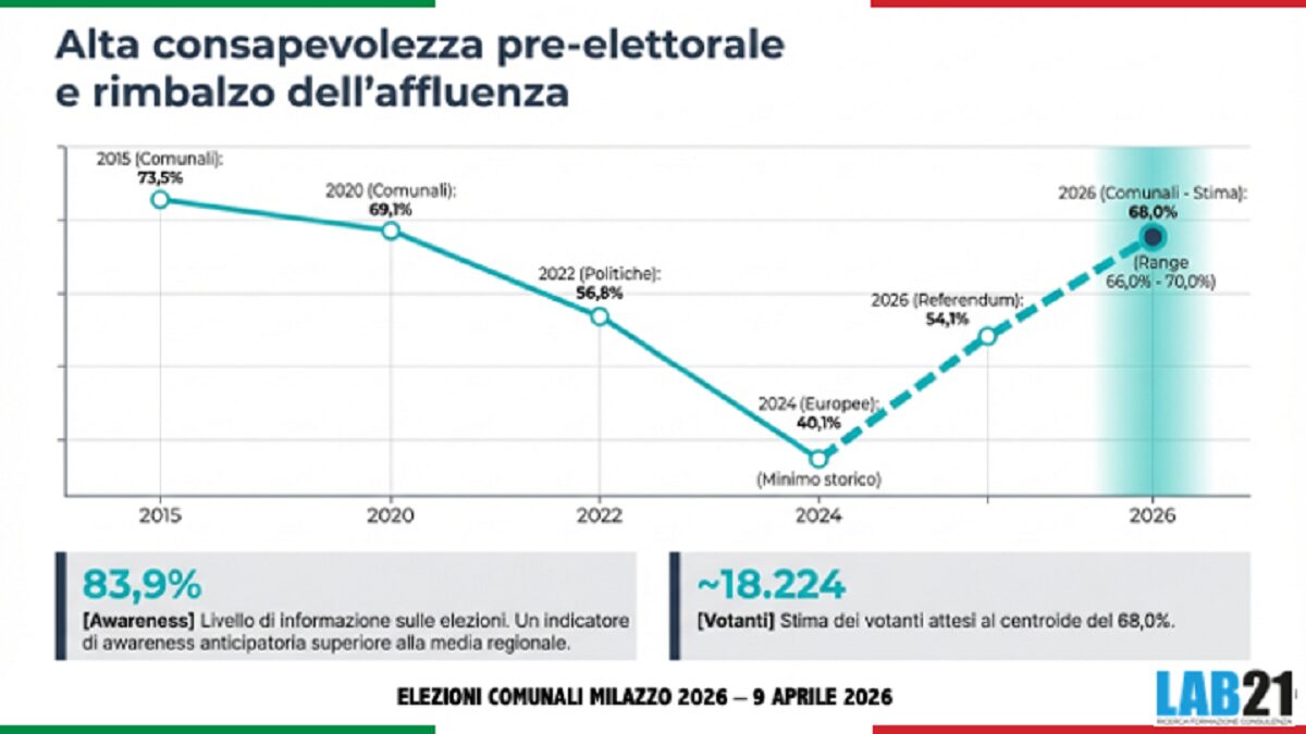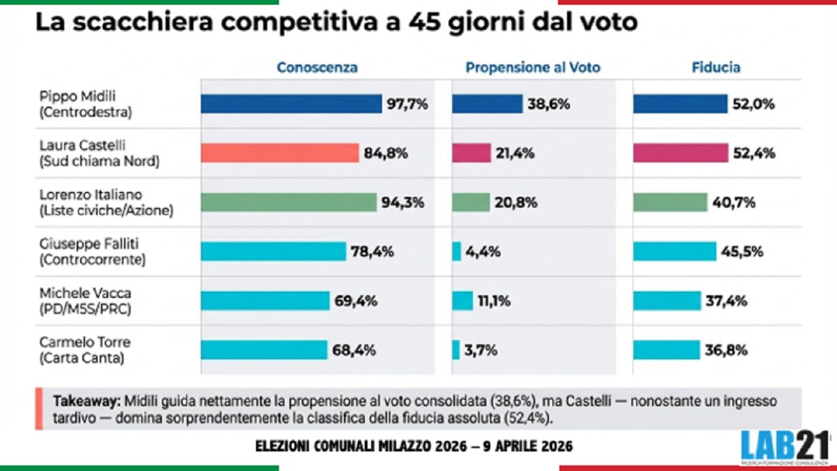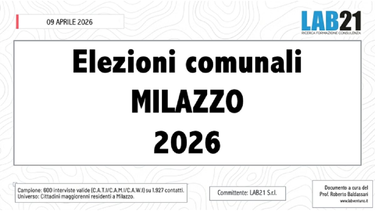 Primo sondaggio politico sulle elezioni comunali di Milazzo, città di circa 30 mila abitanti in provincia di Messina. Secondo un rilevamento di Lab21, Pippo Midili (centrodestra, sindaco uscente) “domina il parametro della notorietà con un 97,7% di conoscenza — valore pressoché universale, che riflette il vantaggio strutturale dell’incumbency. La sua propensione al voto consolidata (38,6%) lo colloca nettamente in testa, mentre la fiducia (52,0%) rimane maggioritaria ma non schiacciante. Il profilo è quello di un candidato che parte favorito, ma che non può contare su un consenso unanime: quasi la metà dell’elettorato che lo conosce non esprime piena fiducia nella sua figura”.