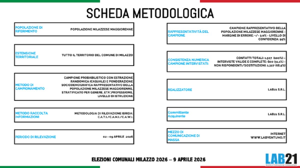 “I dati suggeriscono almeno tre scenari aperti: a 45 giorni dal voto, Milazzo presenta una competizione più aperta di quanto il dominio di notorietà del sindaco uscente potrebbe far pensare. Il dato sulla fiducia — che vede Castelli sorpassare Midili nonostante il dato della conoscenza ancora inferiore— segnala l’esistenza di un elettorato ricettivo a proposte alternative, purché queste riescano a raggiungere e convincere i segmenti ancora poco informati. La campagna elettorale delle prossime settimane dirà se questo potenziale rimarrà tale o si trasformerà in movimento reale. Ma una cosa è certa: la partita non è chiusa”, chiude l’analisi del sondaggio di Lab21.